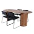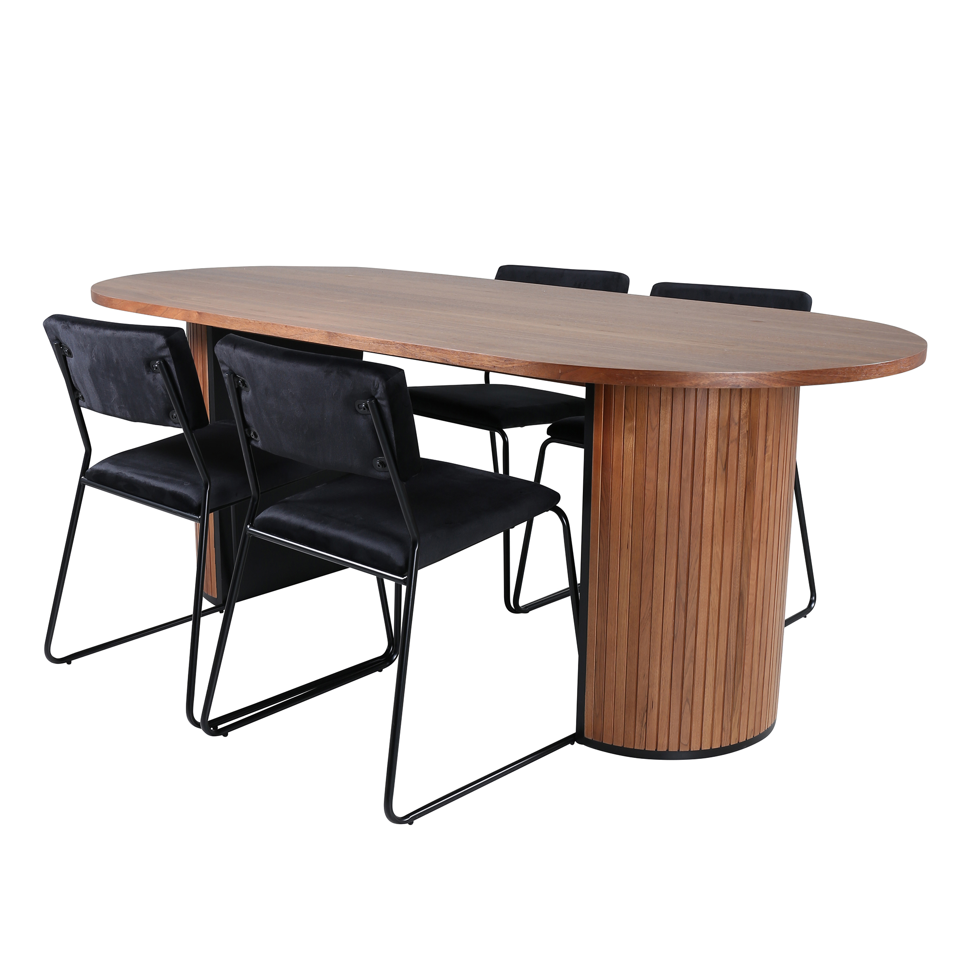 Matgrupp Bianca från Venture Home. Med ett ovalt matbord i valnötsfärgad MDF med faner med valnötsfärgade samt svarta bordsben i trä och MDF. Matchas med 4 st Kungshamn matstolar med svarta stolsben i järn och ljusgråa sitsar i sammet.