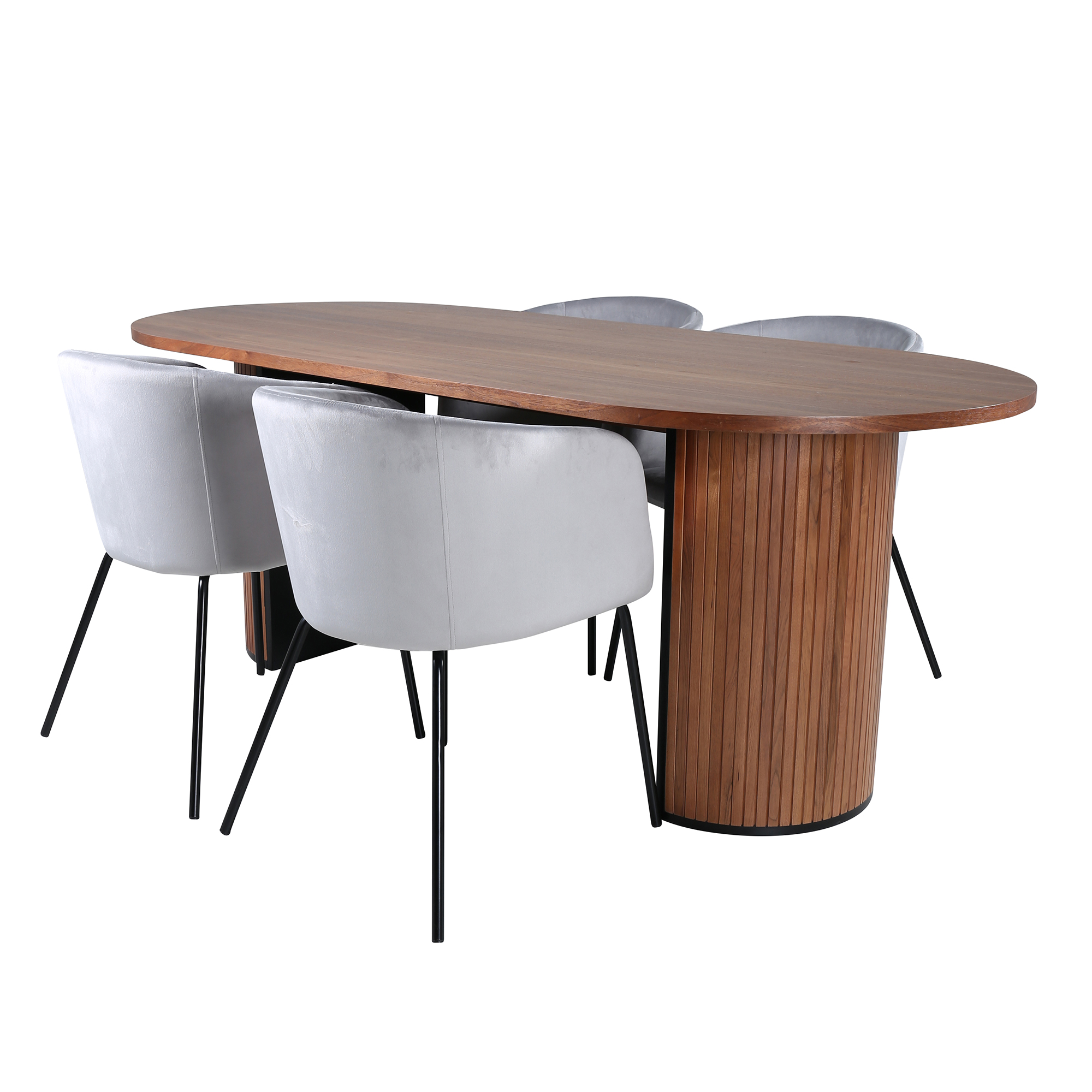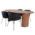 Matgrupp Bianca från Venture Home. Med ett ovalt matbord i valnötsfärgad MDF med faner med valnötsfärgade samt svarta bordsben i trä och MDF. Matchas med 4 st Bergen matstolar med svarta stolsben i järn och sitsar i sammet.