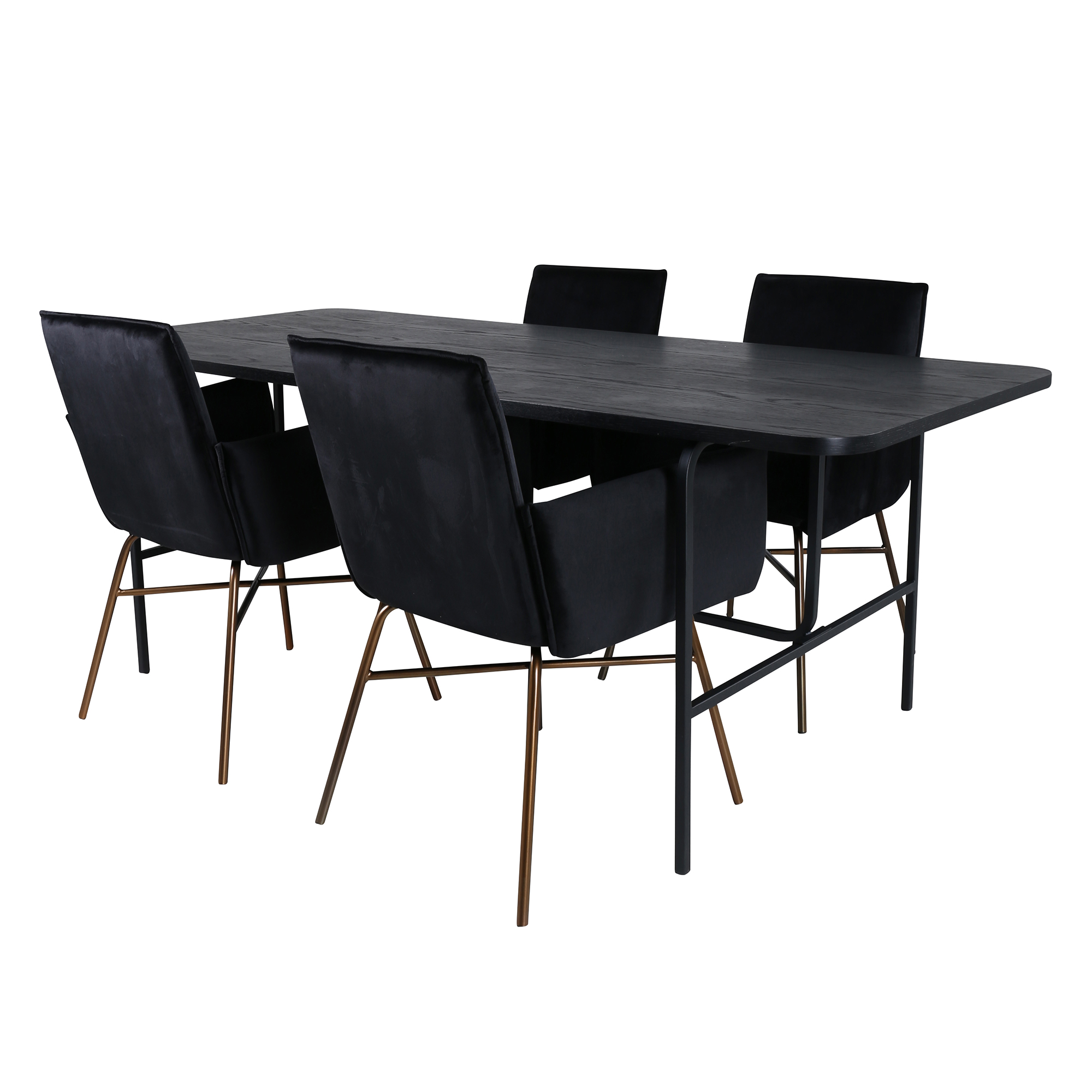 Matgrupp Chicago från Venture Home. Med ett matbord i valnötsfärgad MDF med faner med svarta bordsben i metall. Matchas med 4 st Annika matstolar med kopparfärgade stolsben i järn och svarta sitsar i sammet.