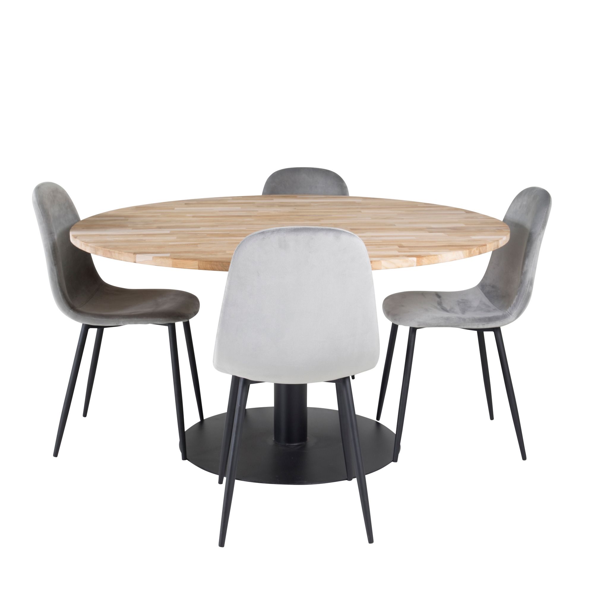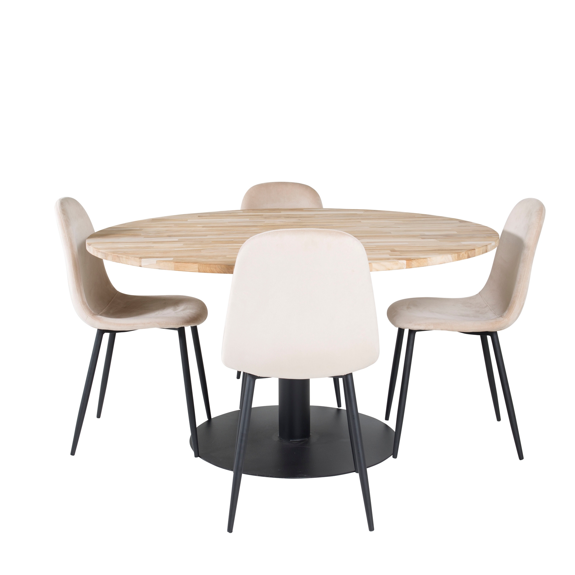 Matgrupp Cornelia med 4 Pobbie Stolar från Venture Home är en stilren matgrupp med ett runt Cornelia-matbord med en bordsskiva i teak och ett svart underrede i metall samt fyra Pobbie-matstolar i tyg/PU med stolsben i metall.