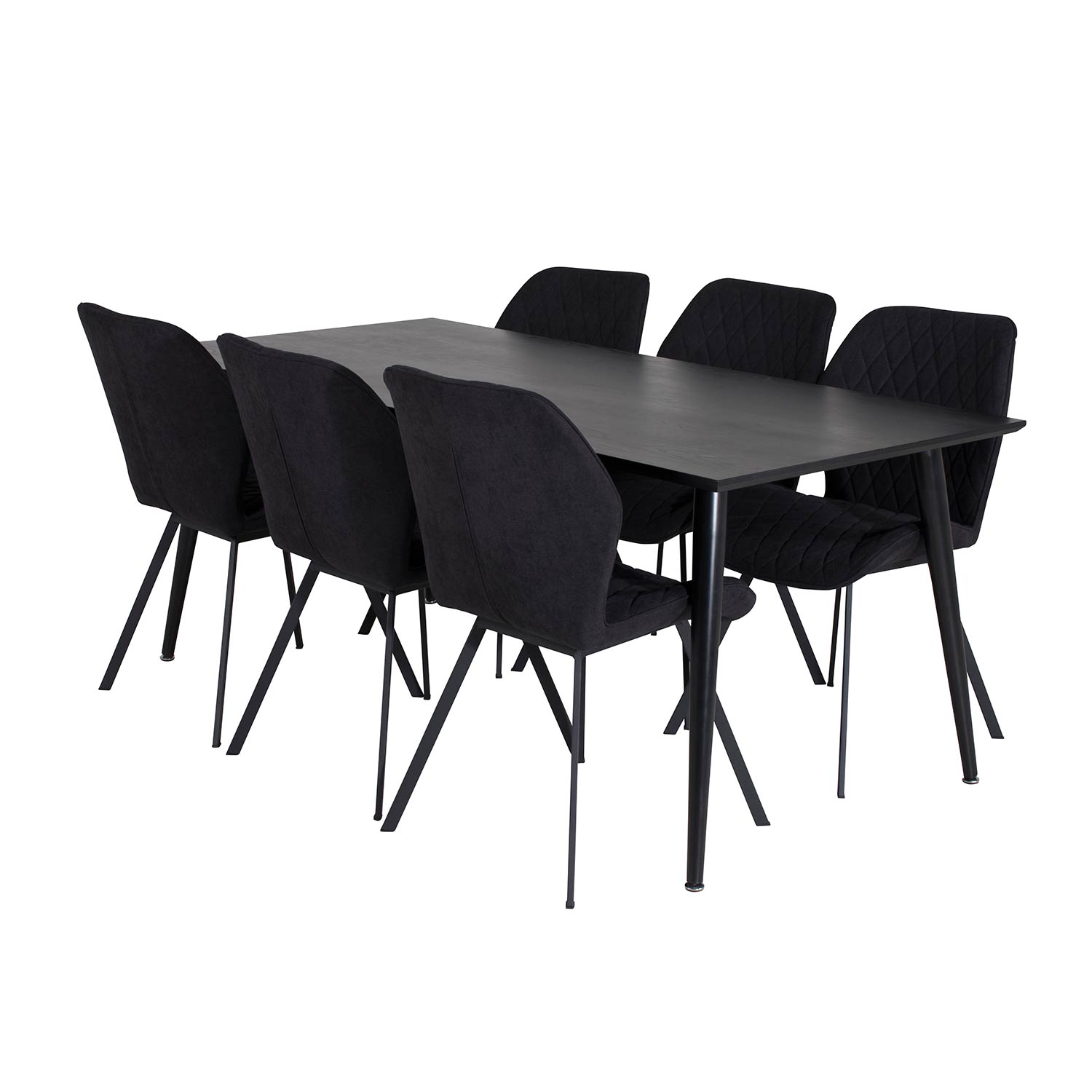 Matgrupp Dipp med 6 Gemma Stolar från Venture Home är en modern matgrupp med ett rektangulärt matbord med en stomme och ben i svart pulverlackerad metall samt med en bordsskiva i svart fanér med en kärna i MDF. Det medföljer sex matstolar i en helklädd exklusiv design med ben i svart pulverlackerad metall. stoppad rygg och sits i ett skålformat utförande i polyestertyg. Dekorsömmen på insidan av rygg och sits bildar ett snyggt rutmönster. Lättare montering krävs.