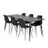 Matgrupp DIpp med 6 Polar Stolar från Venture Home är en modern matgrupp med ett rektangulärt matbord med en stomme och ben i svart pulverlackerad metall samt med en bordsskiva i svart fanér med en kärna i MDF. Det medföljer sex matstolar i modern design med ben i svart pulverlackerad metall. Skålformad rundad rygg och sits i helgjuten plast. Lättare montering krävs.