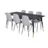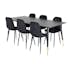 Matgrupp Dipp med 6 Polar Stolar Sammet från Venture Home är en modern matgrupp med ett rektangulärt matbord med en stomme och ben i svart pulverlackerad metall samt med en bordsskiva i svart fanér med en kärna i MDF. Det medföljer sex matstolar i en helklädd design med ben i svart pulverlackerad metall. Lätt rundad rygg och sits i stoppat polyestertyg med dekorsömmar på insidan av rygg och sits som bildar ett rutmönster. Lättare montering krävs.