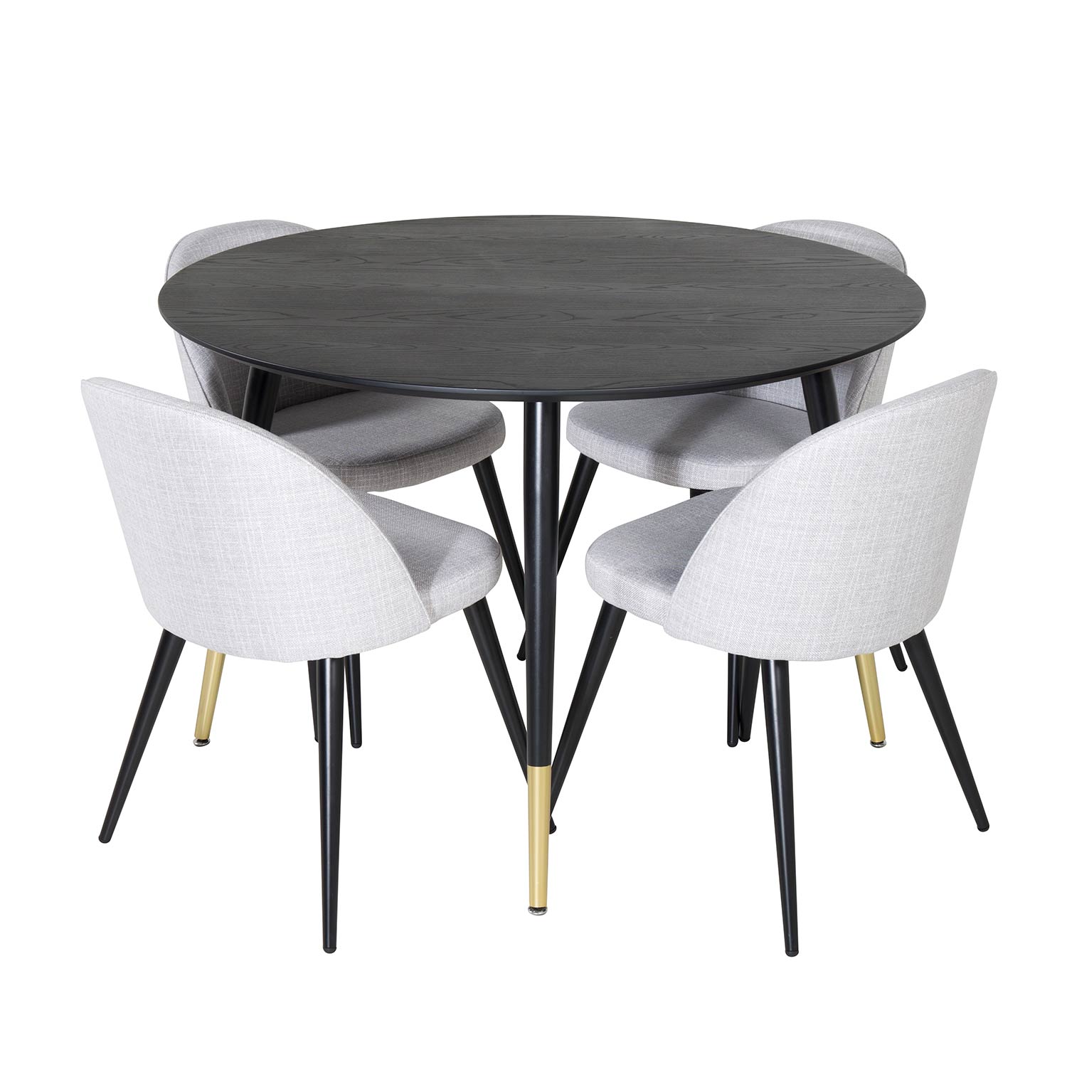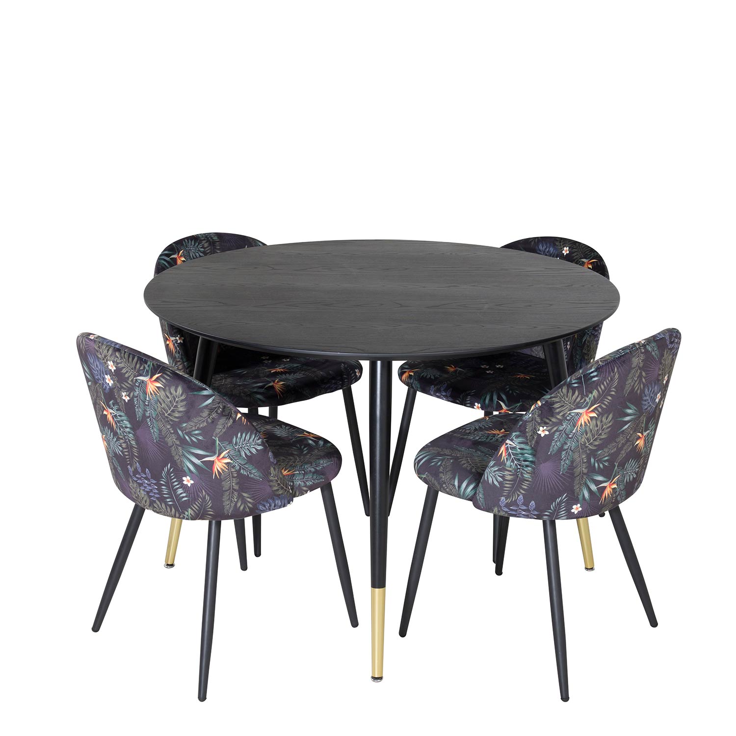 Matgrupp Dipp med Velvet stolar från Venture Home är en stilren matgrupp med ett svart runt matbord och fyra stycken stolar med svarta ben med vackra detaljer.