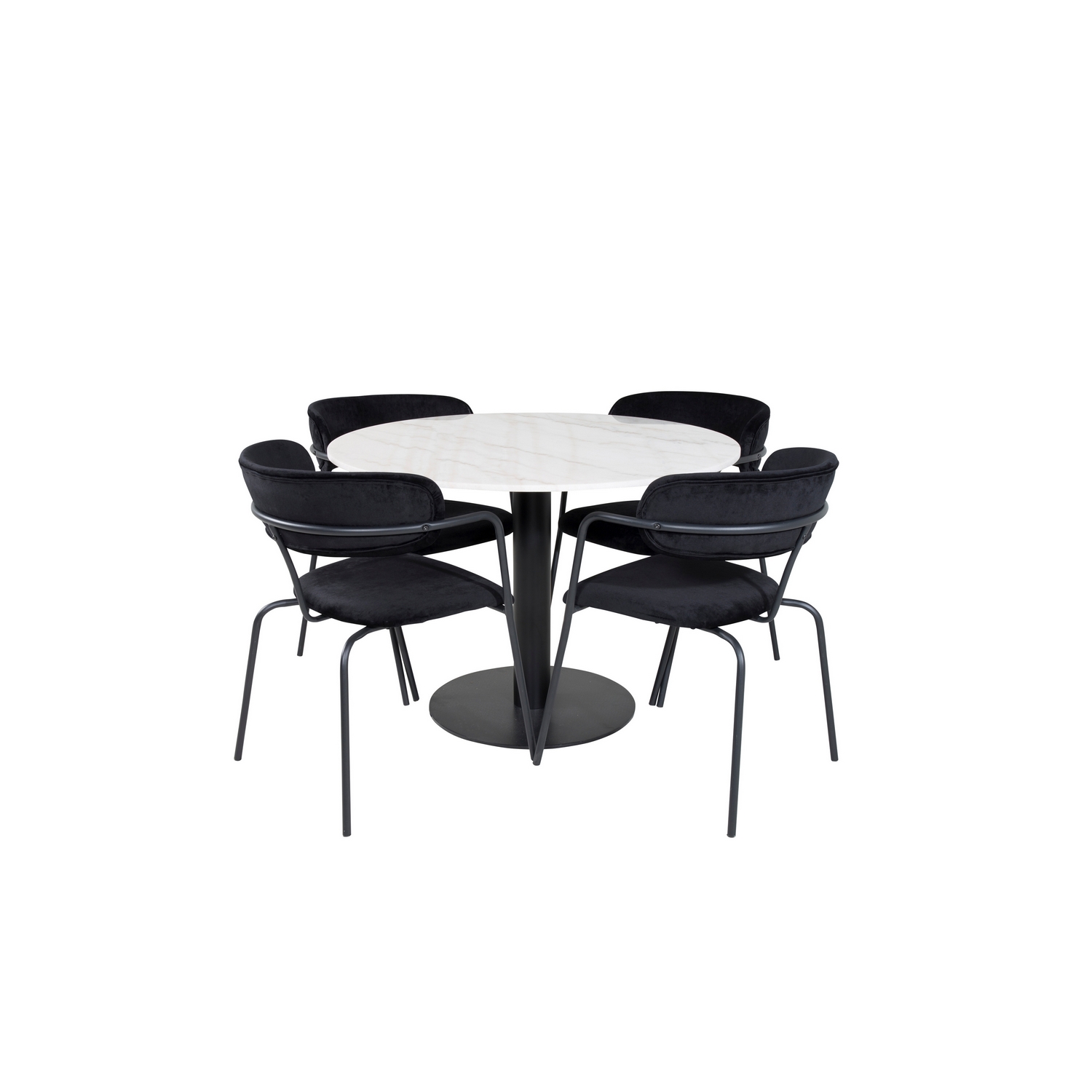 Matgrupp Estelle med 4 Aris Stolar Sammet från Venture Home är en elegant matgrupp med ett runt matbord i modern design med trumpetfot i pulverlackerad metall med en bordsskiva i marmor. Det medföljer fyra karmstolar med stomme, ben samt integrerade armstöd i svart pulverlackerad metall. Stolarna har en rundad rygg och sits i stoppat sammetstyg. Lättare montering krävs.