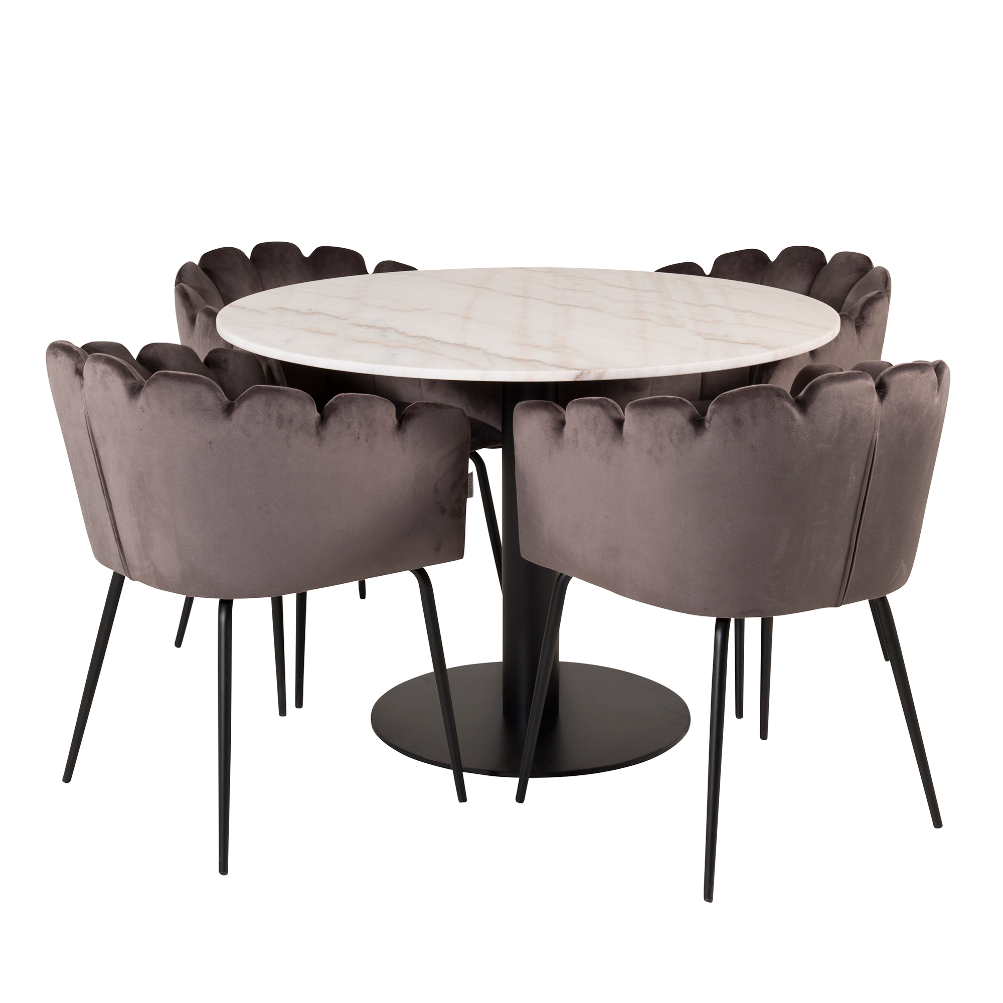 Matgrupp från Furniture Fashion. Runt matbord Estelle med fot och rund centrumpelare. Bordsskiva i marmor. Matstolar Limhamn med stomme och ben i svart metall. Låg rygg i en exklusivt utformad design. Ryggen och sitsen är i sammet. Lättare montering krävs.