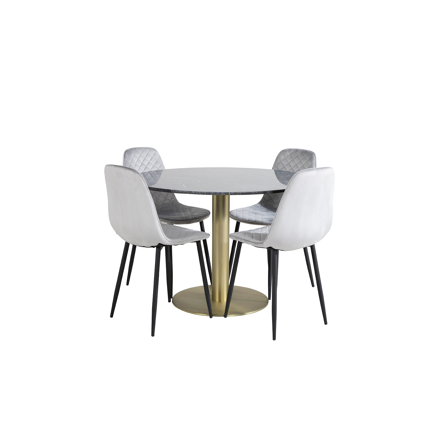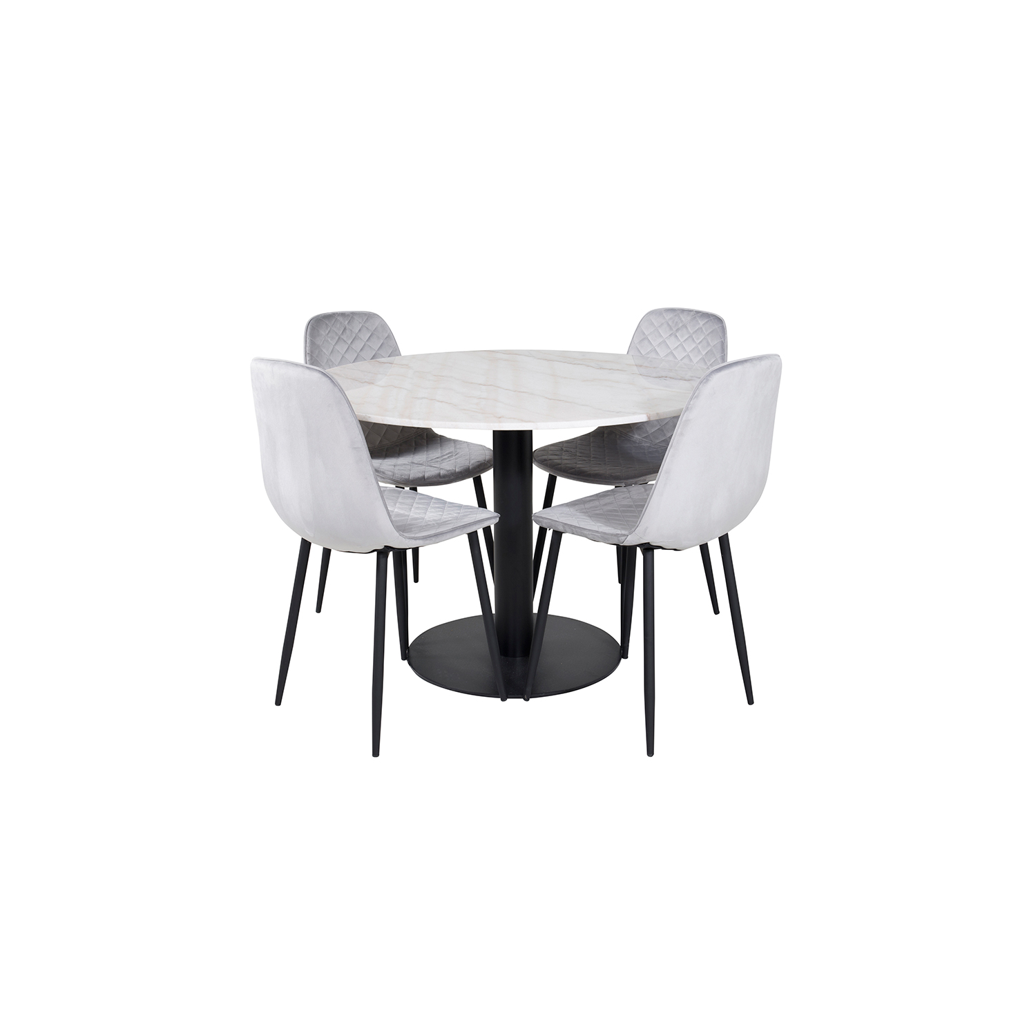 Matgrupp Estelle med 4 Phoi Stolar Sammet från Venture Home är en stilren matgrupp med ett runt matbord i modern design med trumpetfot i pulverlackerad metall med en bordsskiva i marmor. Det medföljer fyra matstolar i en helklädd design med ben i pulverlackerad metall. Stolarna har en lätt rundad rygg och sits i stoppat sammetstyg med dekorsömmar på insidan av rygg och sits som bildar ett rutmönster. Lättare montering krävs.