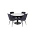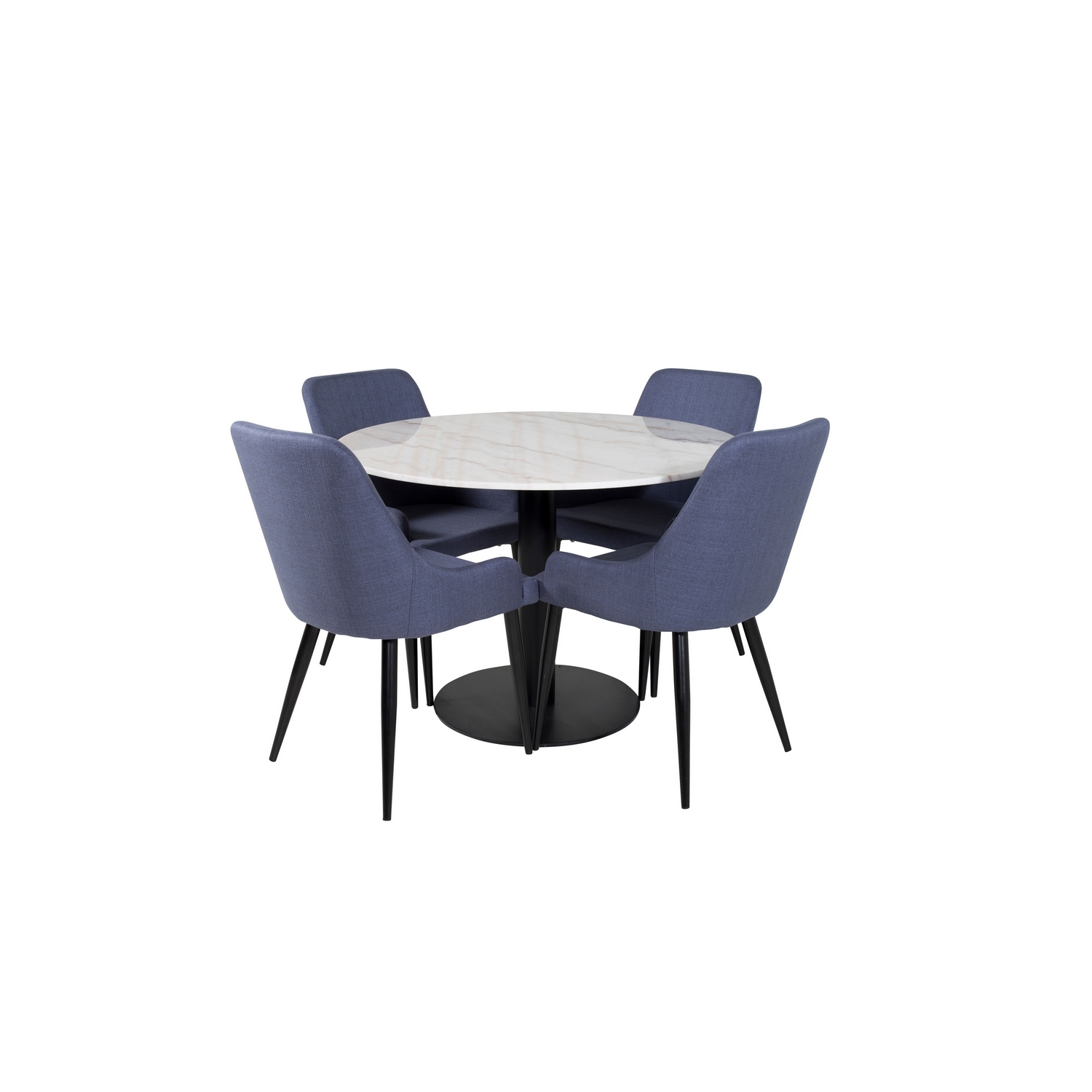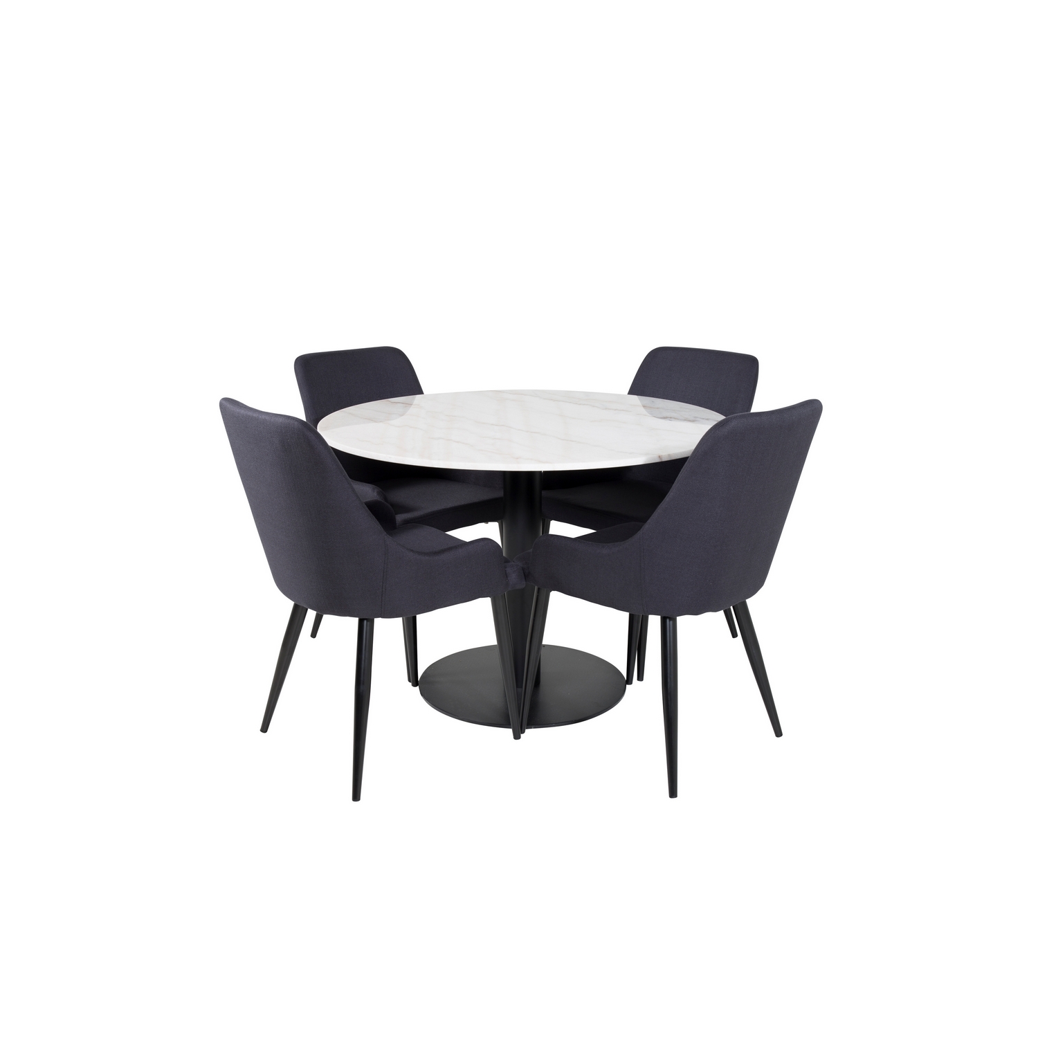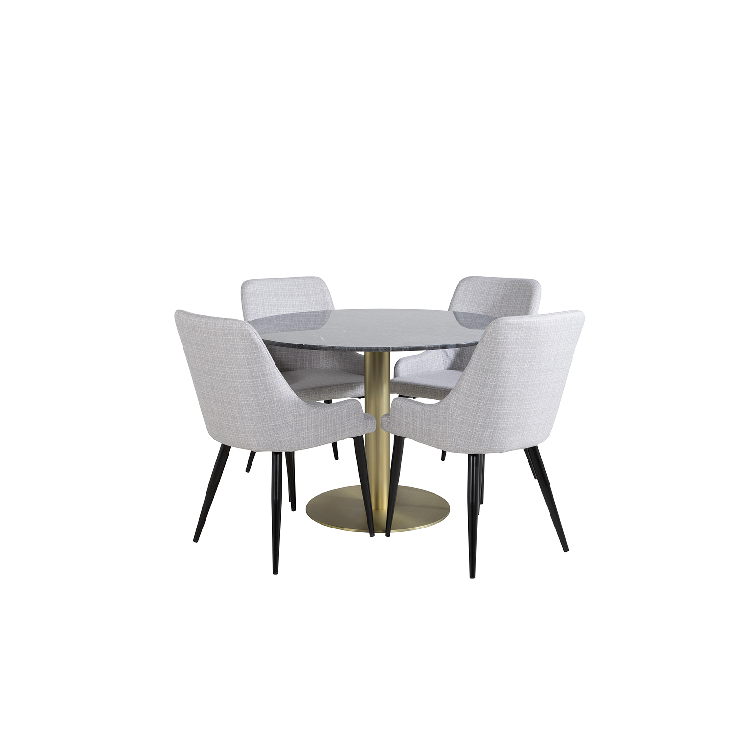 Matgrupp Estelle med 4 Plake Fåtöljer PolyEstelletyg från Venture Home är en stilren matgrupp med ett runt matbord i modern design med trumpetfot i pulverlackerad metall med en bordsskiva i marmor. Det medföljer fyra fåtöljer/matstolar i en helklädd design med ben i pulverlackerad metall. Stolarna har en rygg och sits i polyEstelletyg med mjuk stoppning. Lättare montering krävs.