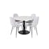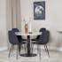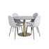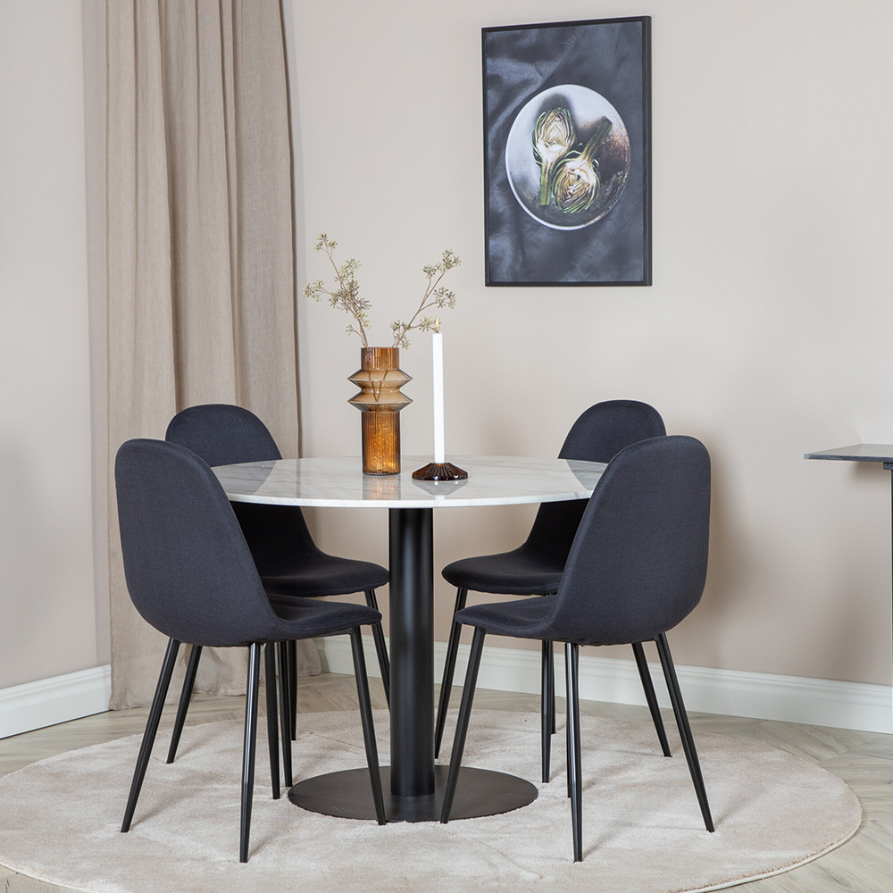 Matgrupp Estelle med 4 Pobbie Stolar PolyEstelletyg från Venture Home är en elegant matgrupp med ett runt matbord i modern design med trumpetfot i pulverlackerad metall med en bordsskiva i marmor. Det medföljer fyra matstolar i en helklädd design med ben i pulverlackerad metall med en lätt rundad rygg och sits i polyEstelletyg. Lättare montering krävs.