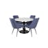 Matgrupp Estelle med 4 Vera Stolar PolyEstelletyg från Venture Home är en stilren matgrupp med ett runt matbord i modern design med trumpetfot i pulverlackerad metall med en bordsskiva i marmor. Det medföljer fyra matstolar i helklädd design med ben i svart pulverlackerad metall. Stolarna har en rygg med knappar och dekorsöm samt rygg och sits i polyEstelletyg med mjuk stoppning. Lättare montering krävs.