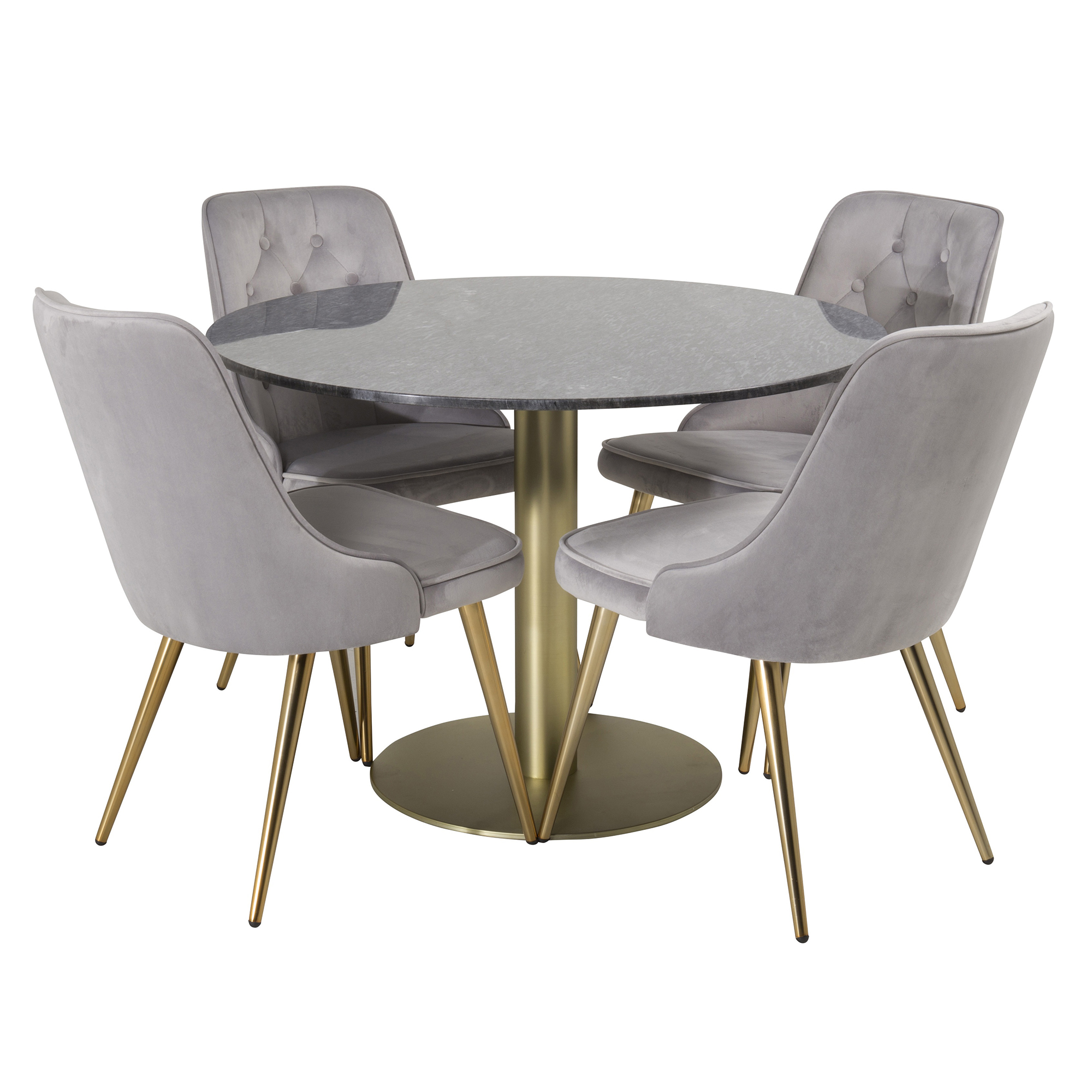 Matgrupp Estelle från Venture Home med ett runt matbord i svart marmor med mässingsfärgade bordsben i metall. Matchas med 4 st Vera matstolar med stolsits i sammet och stolsben i metall.