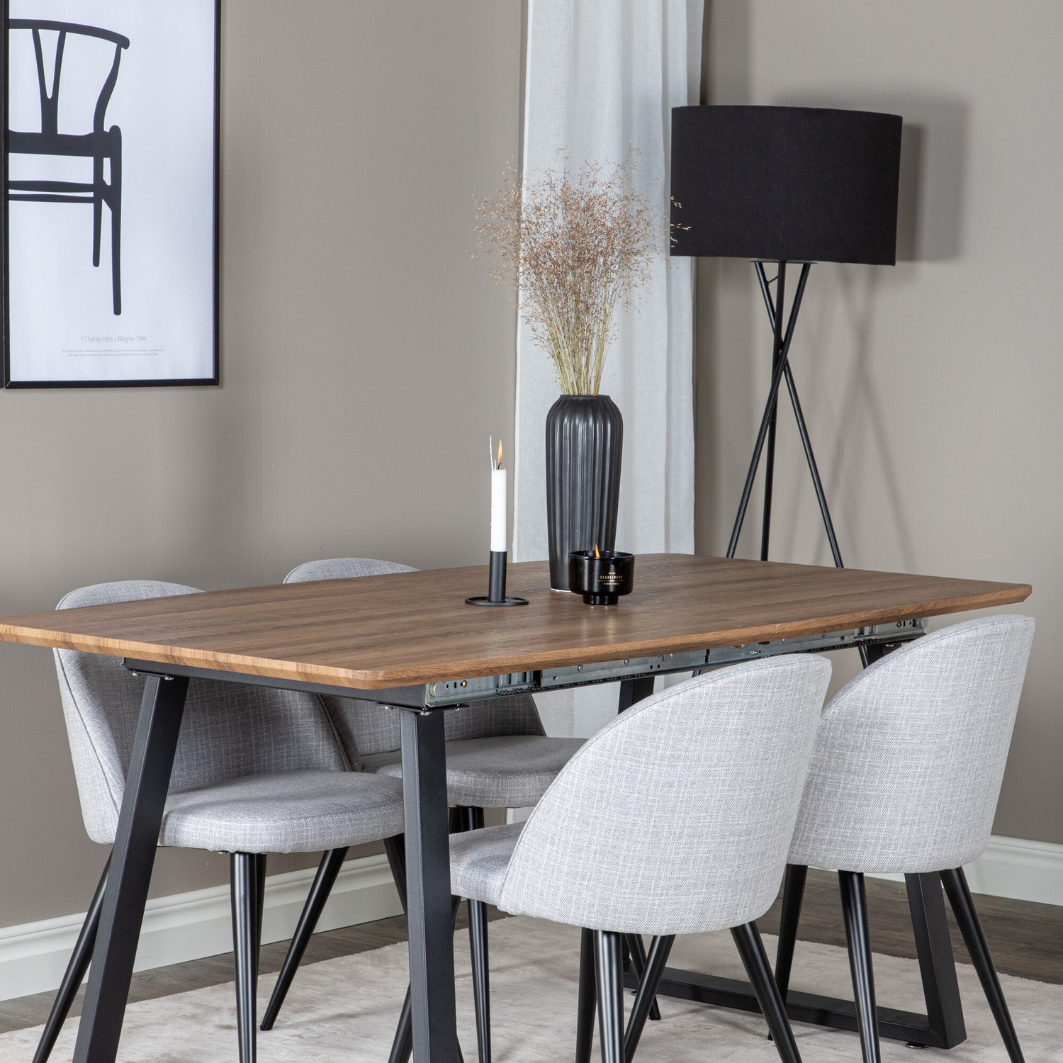 Matgrupp Ina med 4 Valentina Stolar Polyestertyg från Venture Home är en modern matgrupp med ett förlängningsbart matbord i MDF med bordsben i metall. Det medföljer fyra matstolar med stolsben i metall och sitsar i polyester.