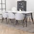Matgrupp Jolie från Venture Home. Med ett förlängningsbart matbord i vit HPL och MDF med svarta bordsben i järn. Matchas med 6 st Valentina matstolar med svarta stolsben i metall och ljusgråa sitsar i polyester.