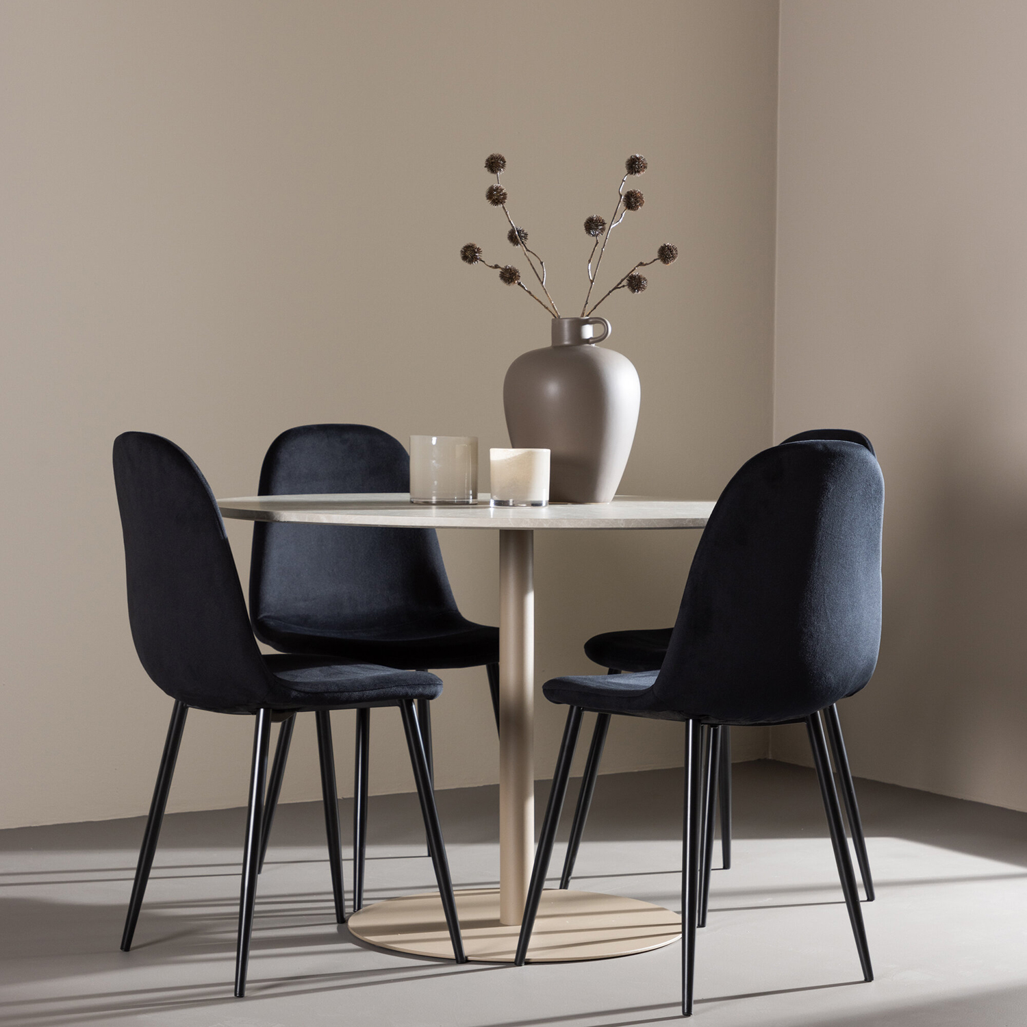 De fyra medföljande Polar-stolarna kompletterar bordet perfekt. Dessa stolar är klädda i mjuk sammet, vilket ger en lyxig och bekväm sittupplevelse. Sammetstyget är känt för sin elegans och komfort, vilket gör att du och dina gäster kan sitta bekvämt under långa middagar och samtal. Stolarnas färg matchar bordet, vilket skapar en enhetlig och sofistikerad look i ditt matrum.