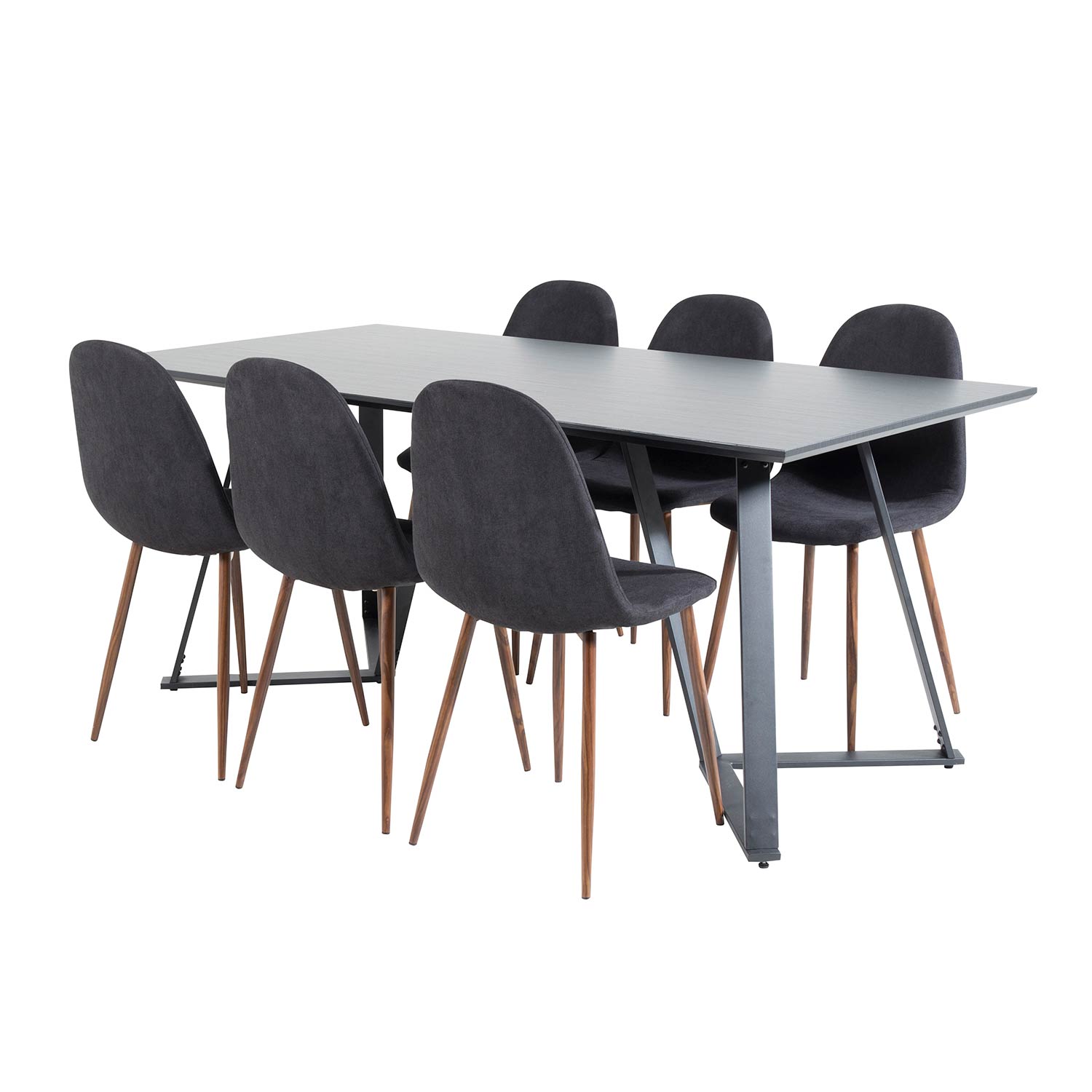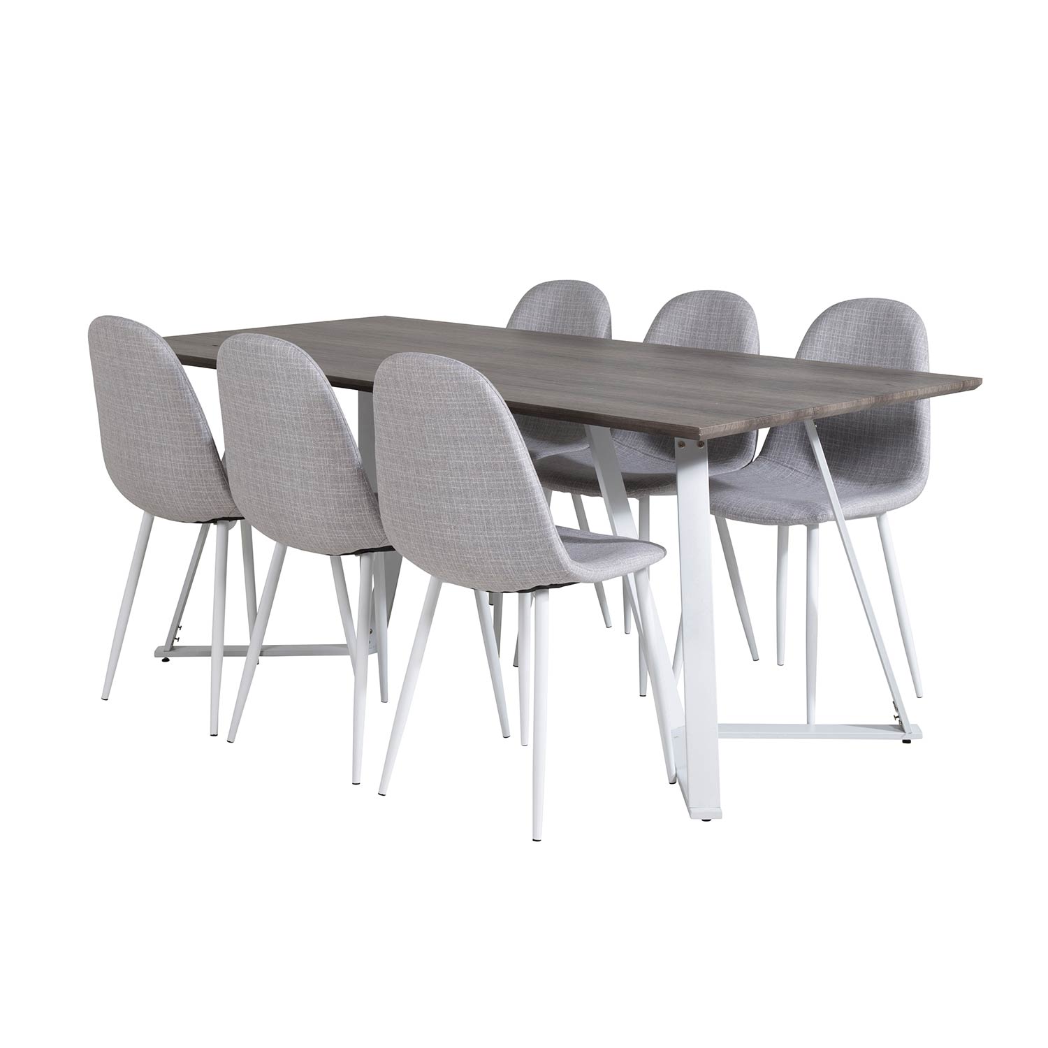 Matgrupp Madde med 6 Pobbie Stolar Polyestertyg från Venture Home är en modern matgrupp med ett matbord i MDF med bordsben i metall. Det medföljer sex matstolar med stolsben i metall och sitsar i polyester.