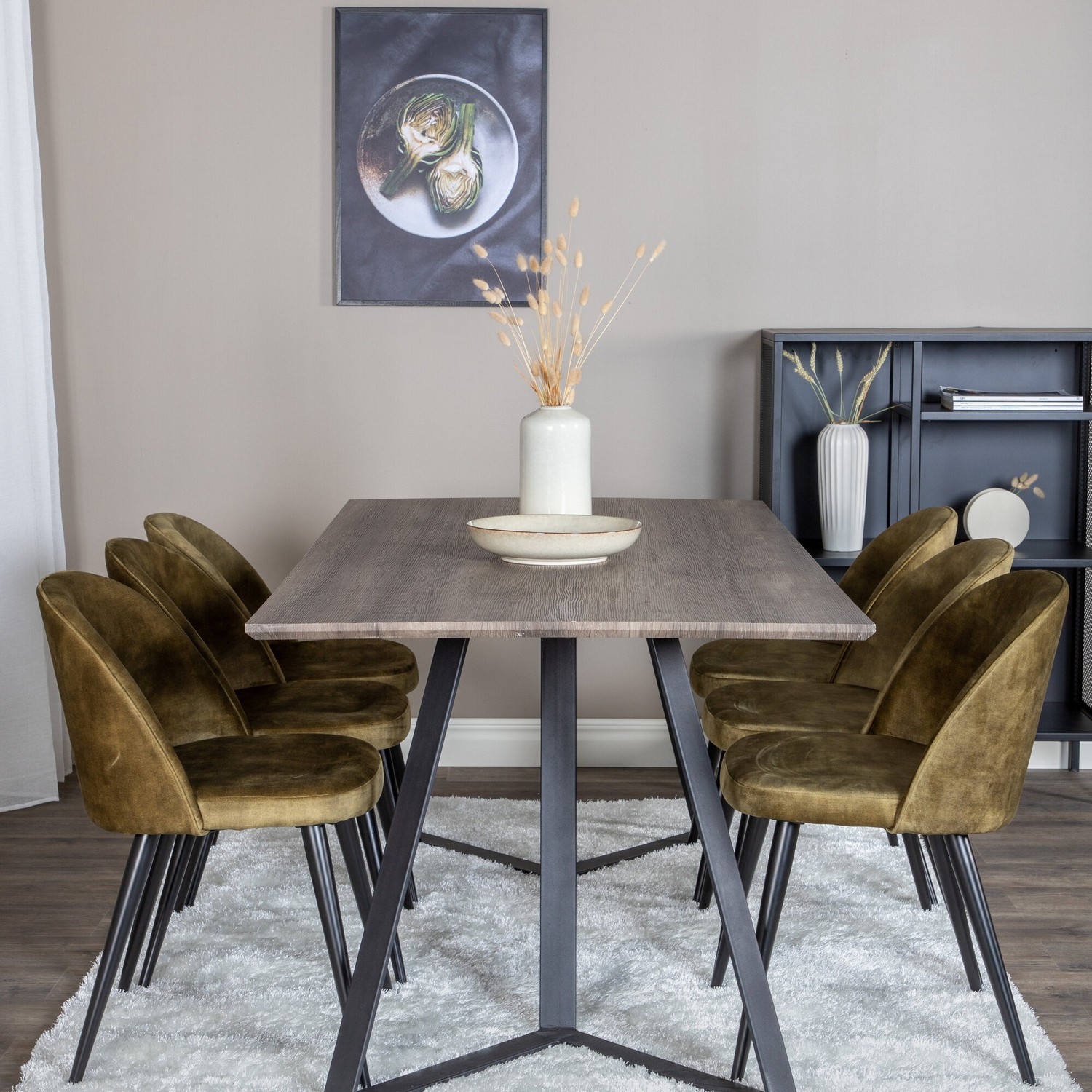 Matgrupp Madde med 6 Valentina Stolar Sammmet från Venture Home är en modern matgrupp med ett matbord i MDF med svarta bordsben i metall. Det medföljer sex matstolar med svarta stolsben i metall och sitsar i sammet.