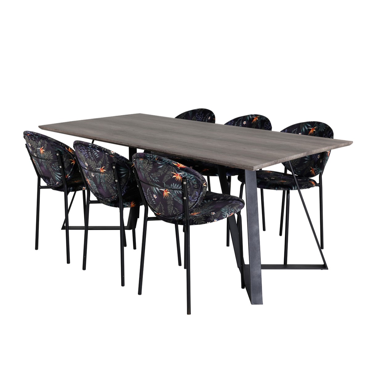 Matgrupp Madde med 6 Valor Stolar Polyestertyg från Venture Home är en modern matgrupp med ett matbord i MDF med svarta bordsben i metall. Det medföljer sex matstolar med svarta stolsben i metall och sitsar i polyester.