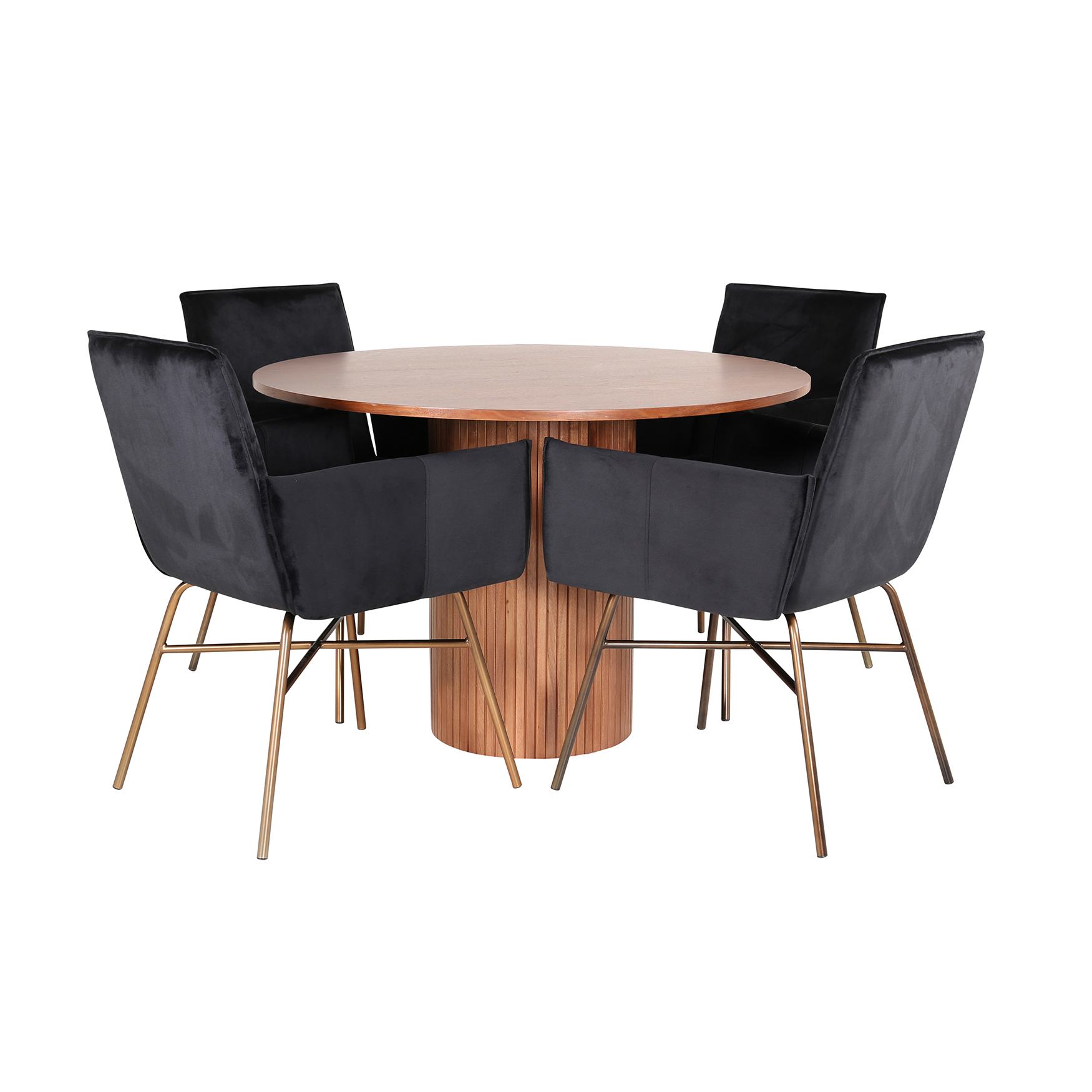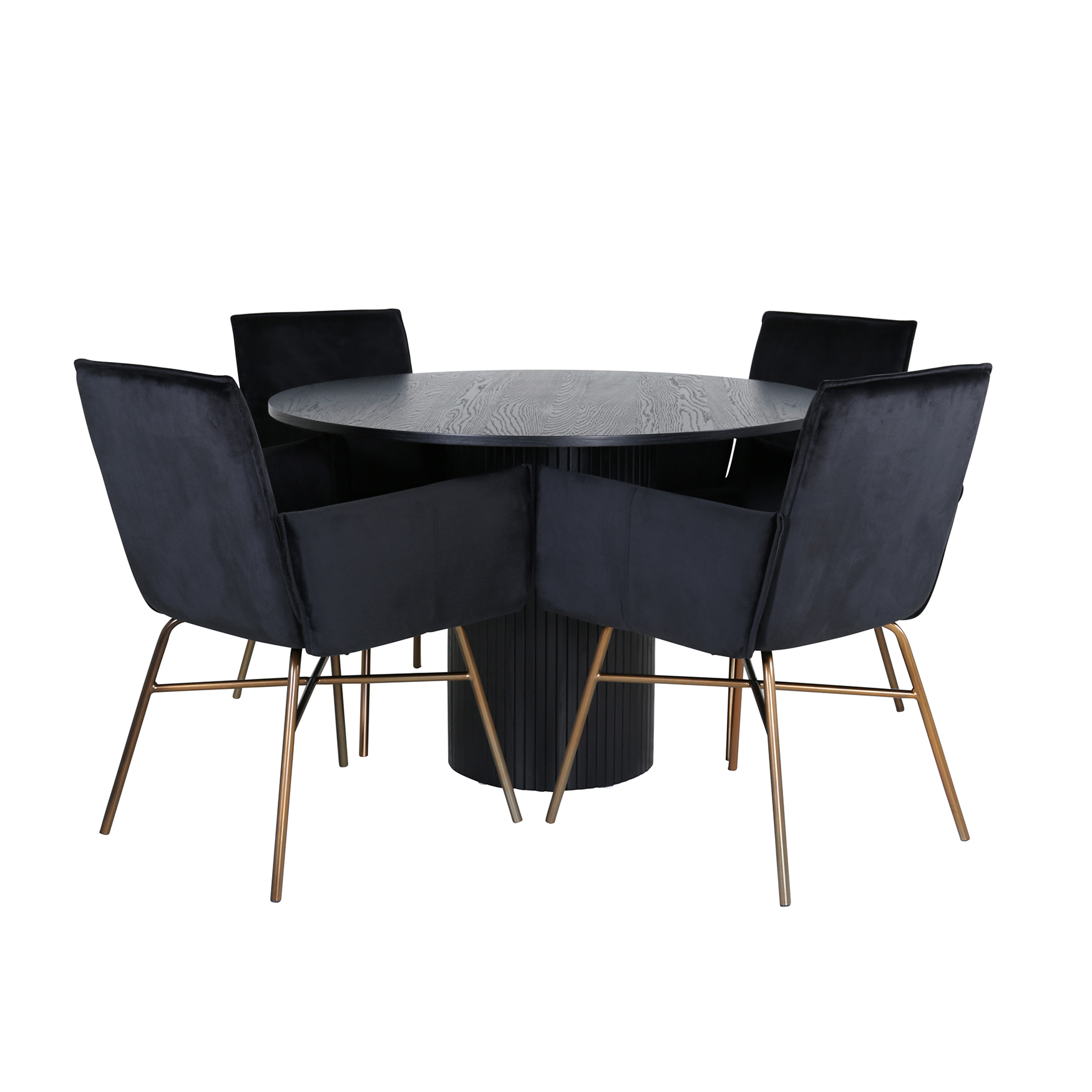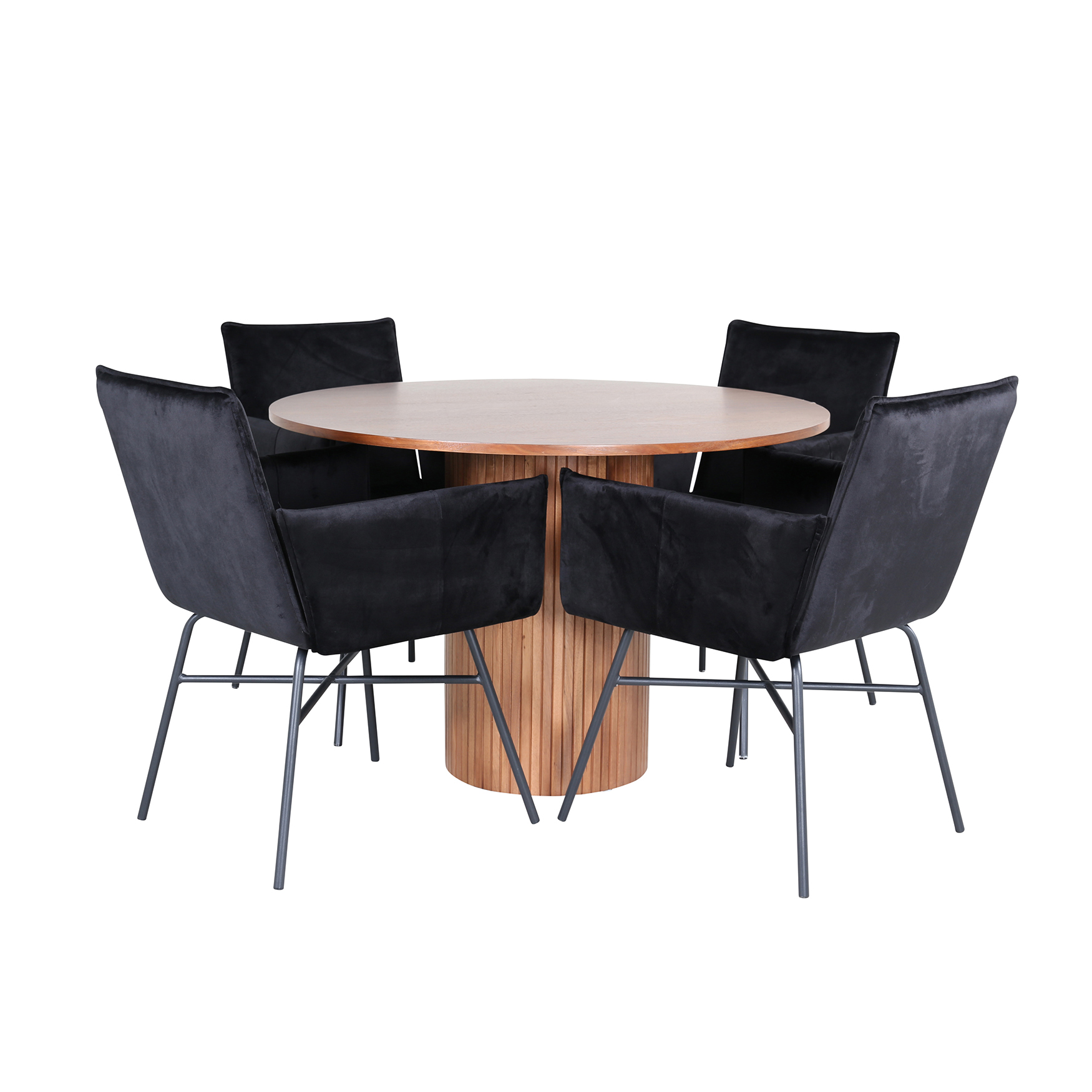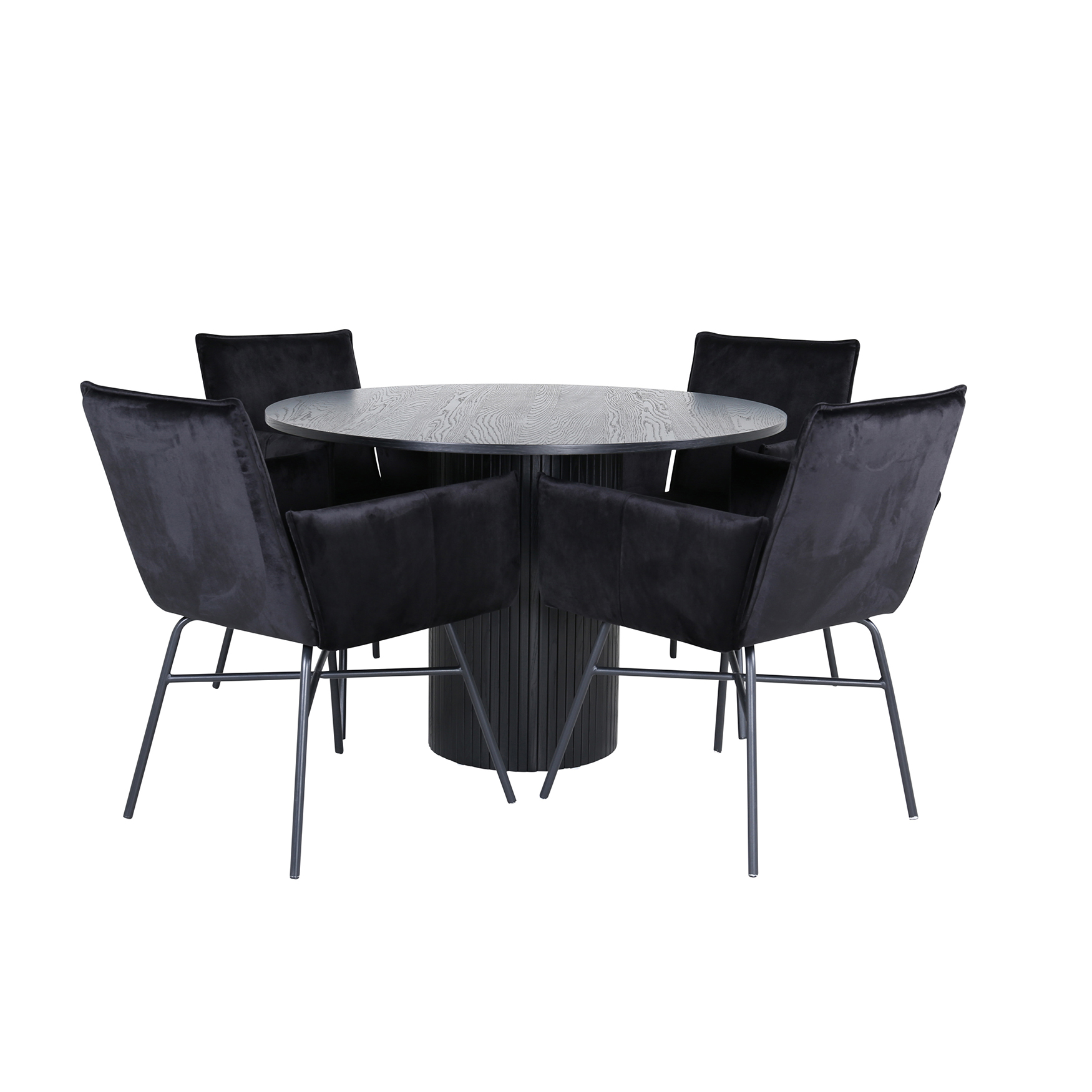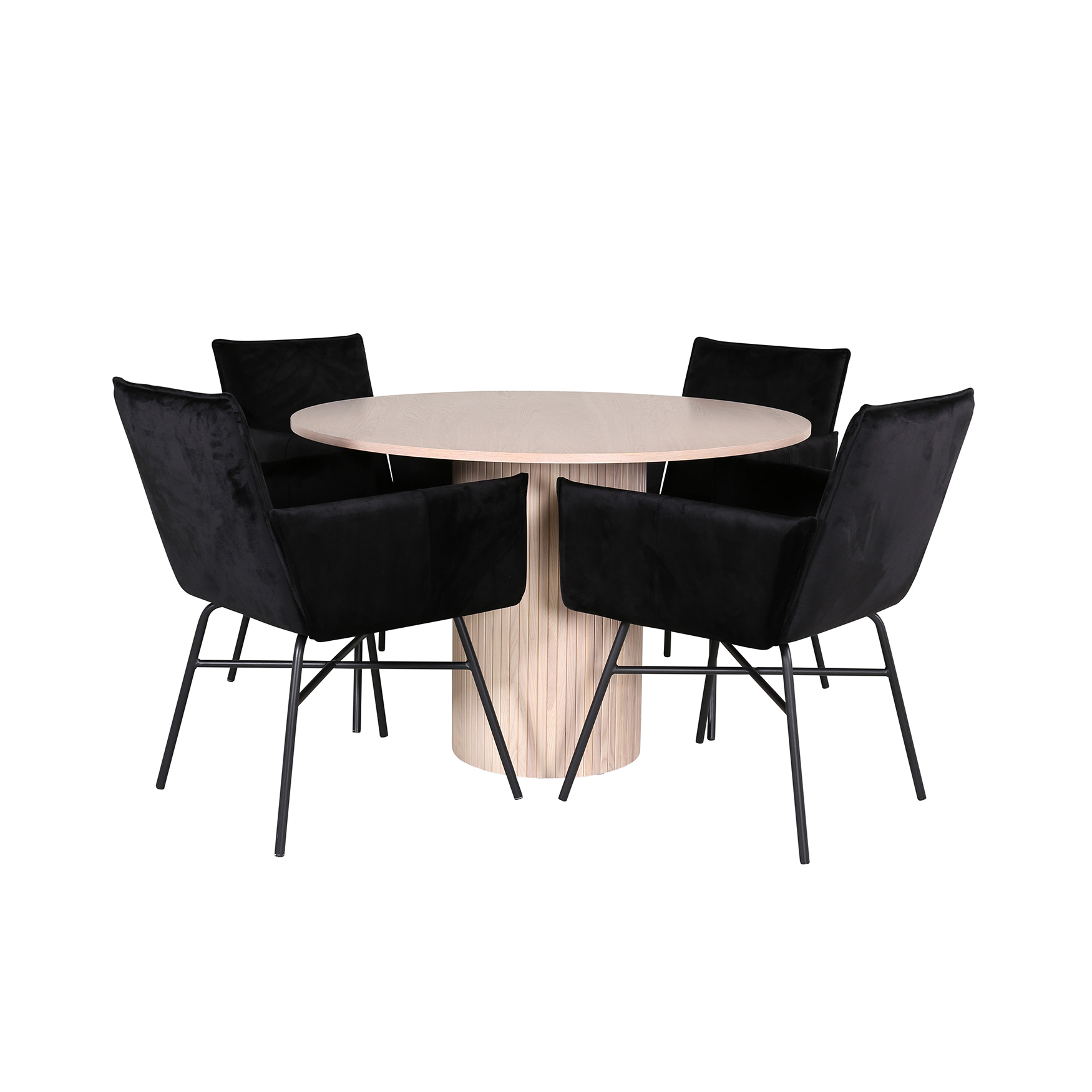 Matgrupp Bianca, med ett runt matbord i MDF med faner med bordsben i trä och MDF. Matchas med 4 st Annika matstolar med sitsar i sammet.