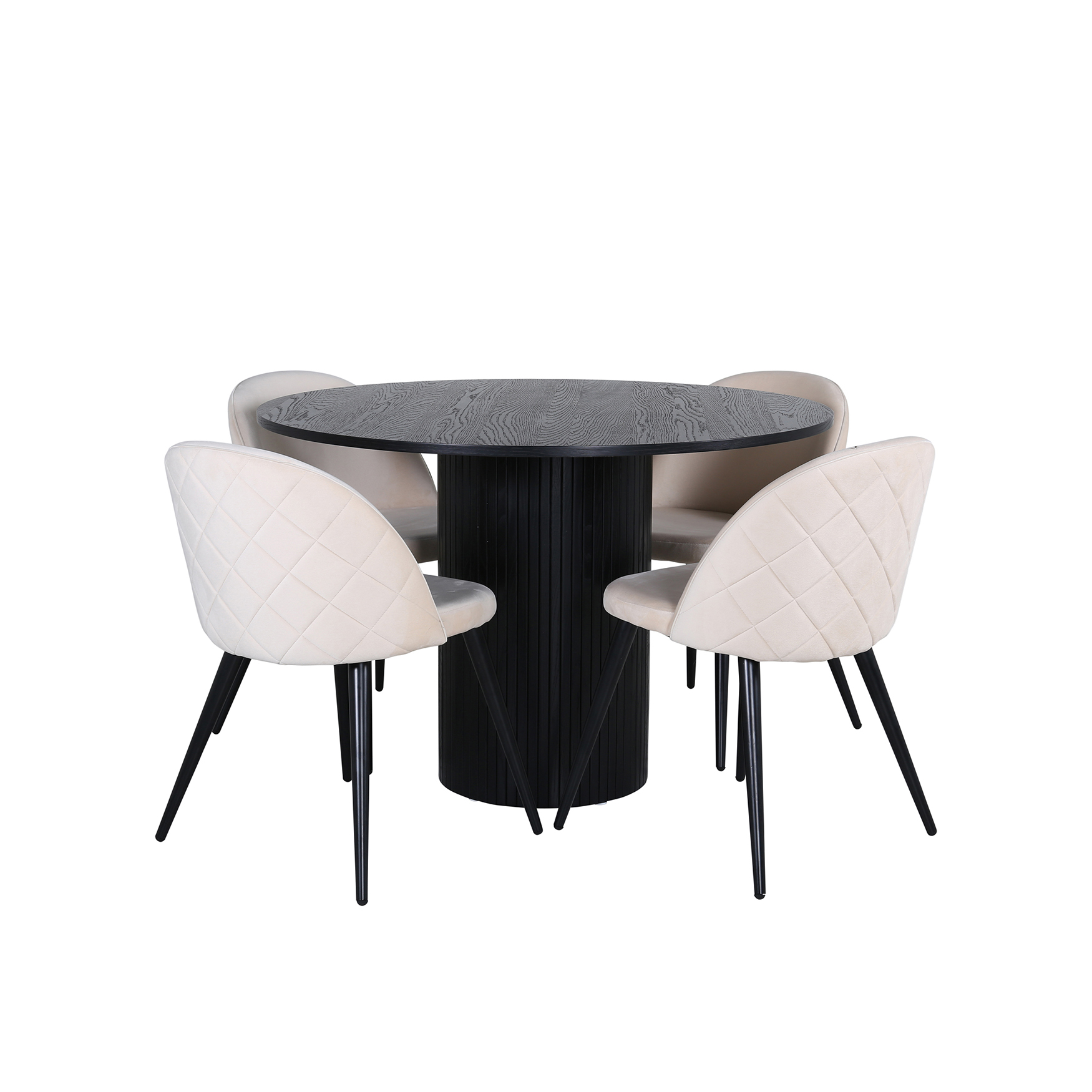 Matgrupp Bianca, med ett runt matbord i MDF med faner med bordsben i trä och MDF. Matchas med 4 st Valentina Stitcthes matstolar med dekorsöm.