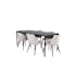 Matgrupp Paris, med ett matbord i svart MDF med faner med svarta bordsben i järn. Matchas med 6st Valentina Stitcthes matstolar med dekorsöm och med svarta stolsben i järn och beigea sitsar i polyester linne.