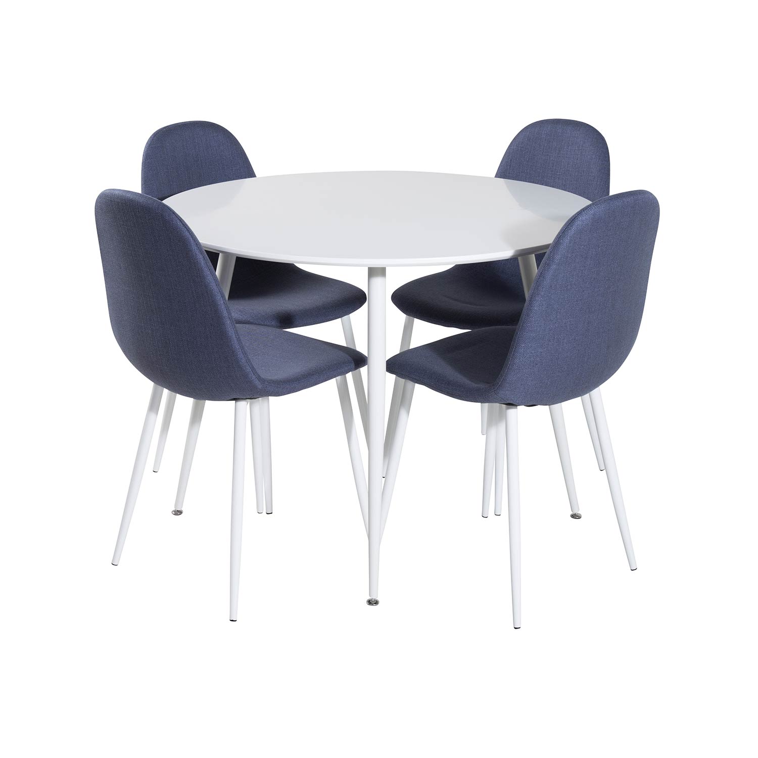 Matgrupp Plake med 4 Pobbie Stolar Polyestertyg Runt från Venture Home är en stilren matgrupp med ett runt matbord med ben i metall och en bordsskiva av MDF. Det medföljer fyra matstolar med stolsben i metall och sitsar i polyester.