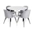 Matgrupp Plake med 4 Valentina Stolar Sammet Runt från Venture Home är en elegant matgrupp med ett runt matbord med ben i metall och en bordsskiva av MDF. Det medföljer fyra matstolar med svarta stolsben i metall och sitsar i sammet.