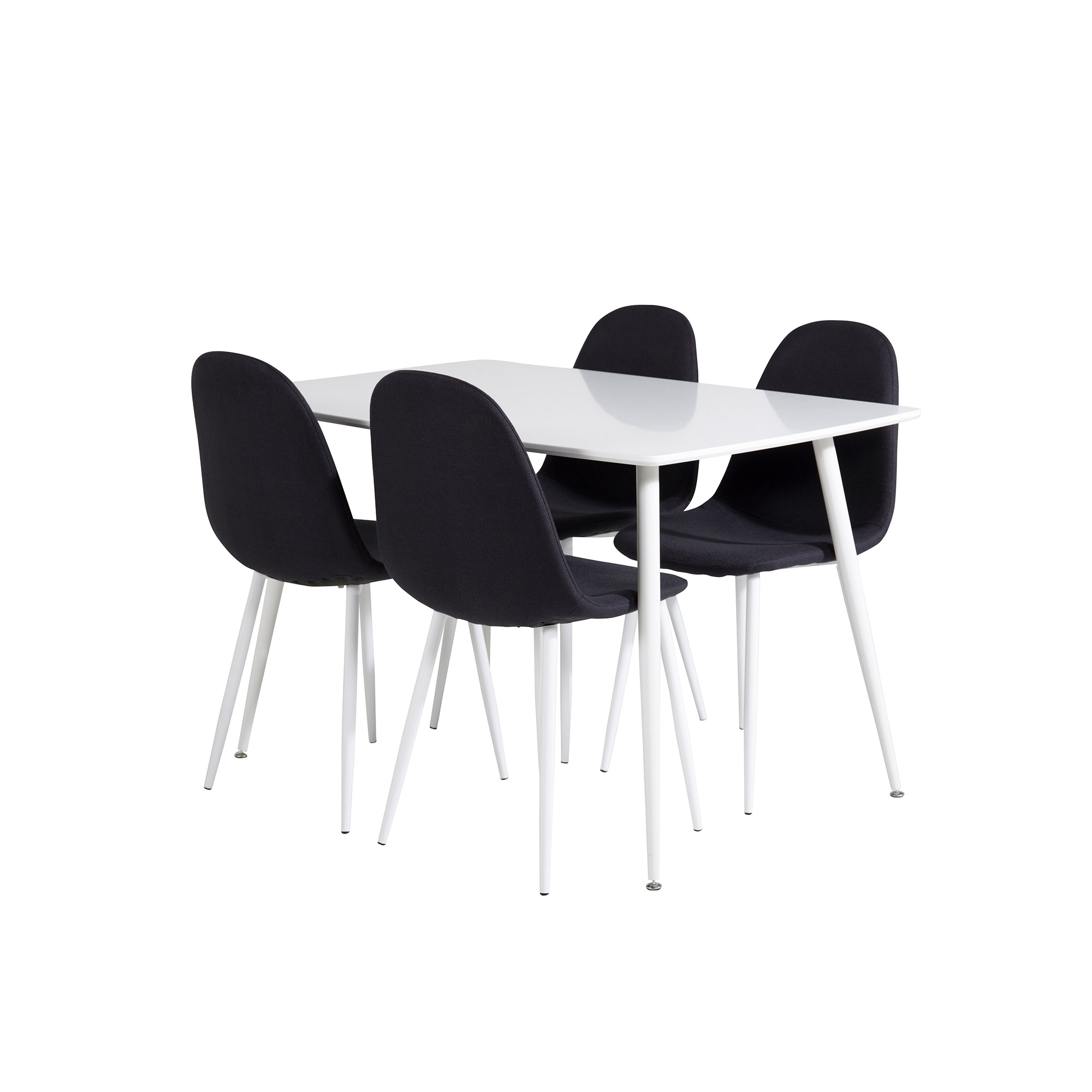 Matgrupp Pobbie, med ett matbord i vit MDF och vita bordsben i metall. Matchas med 4 st Pobbie matstolar med vita stolsben i metall och sitsar i polyester.