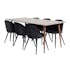 Matgrupp Pobbie med 6 Valentina Stolar Sammet från Venture Home är en elegant matgrupp med ett rektangulärt matbord med ben i metall med en bordsskiva i MDF. Det medföljer sex matstolar med svarta stolsben i metall och sitsar i sammet.