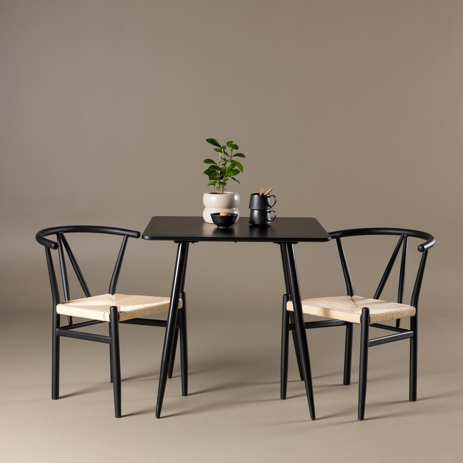 De två Alfons-stolarna kompletterar bordet perfekt med sina eleganta sitsar i rotting och stilrena ben i metall. Dessa stolar erbjuder både komfort och stil, vilket gör dem idealiska för långa, njutbara måltider. Deras moderna design med hög ryggstöd och naturliga material ger ditt matrum eller kök en sofistikerad och samtida touch.