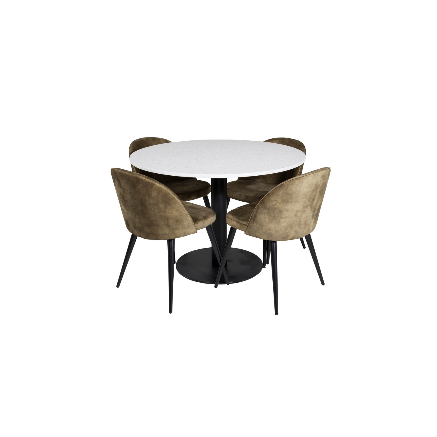 Matgrupp Venture Home Roxanna med 4 Valentina Stolar Polyestertyg Runt är en elegant matgrupp med ett runt matbord i stilren, modern design med trumpetfot i pulverlackad metall och en snygg bordsskiva i grå Terrazzo. Det medföljer fyra matstolar med en helklädd design, ben i svart pulverlackerad metall samt rundad rygg och sits i polyestertyg. Rygg och sits har mjuk stoppning. Lättare montering krävs.