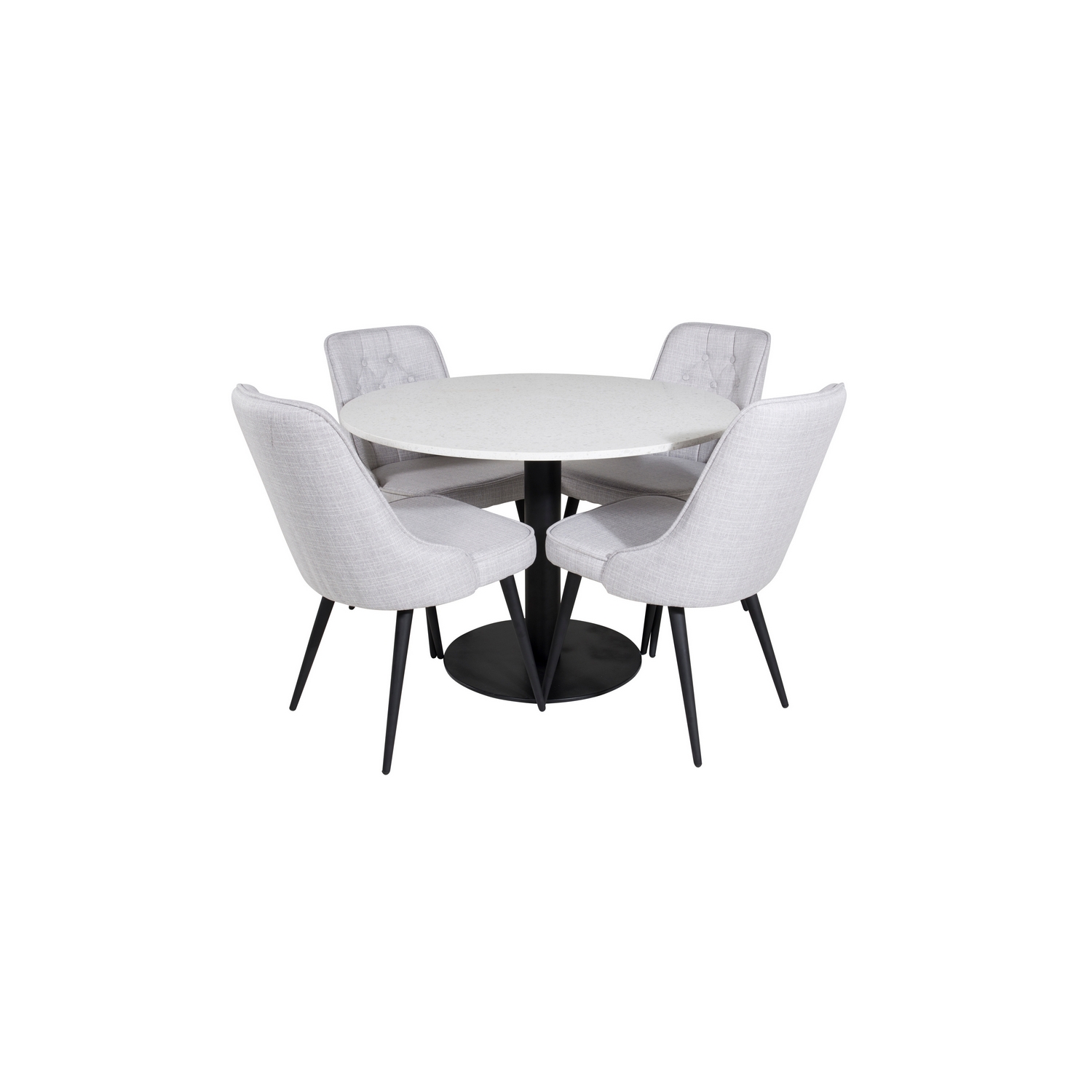 Matgrupp Venture Home Roxanna med 4 Vera Stolar Polyestertyg Runt är en elegant matgrupp med ett runt matbord i stilren, modern design med trumpetfot i pulverlackad metall och en snygg bordsskiva i grå Terrazzo. Det medföljer fyra matstolar i helklädd design med ben i svart pulverlackerad metall. Stolarna har en rygg med knappar och dekorsöm samt rygg och sits i polyestertyg med mjuk stoppning. Lättare montering krävs.