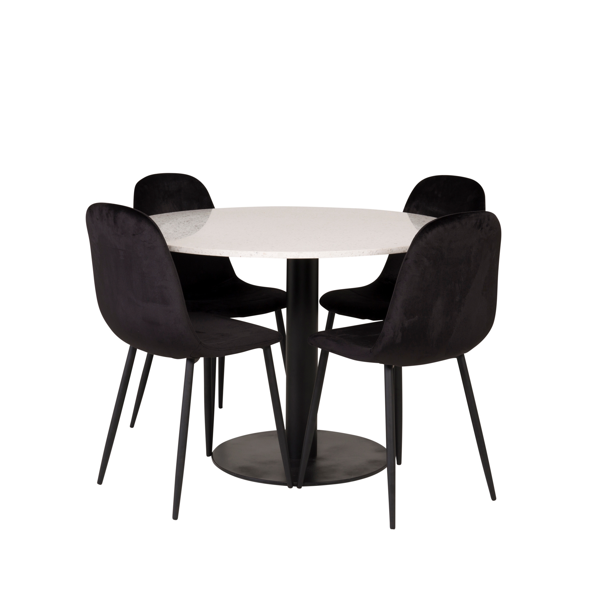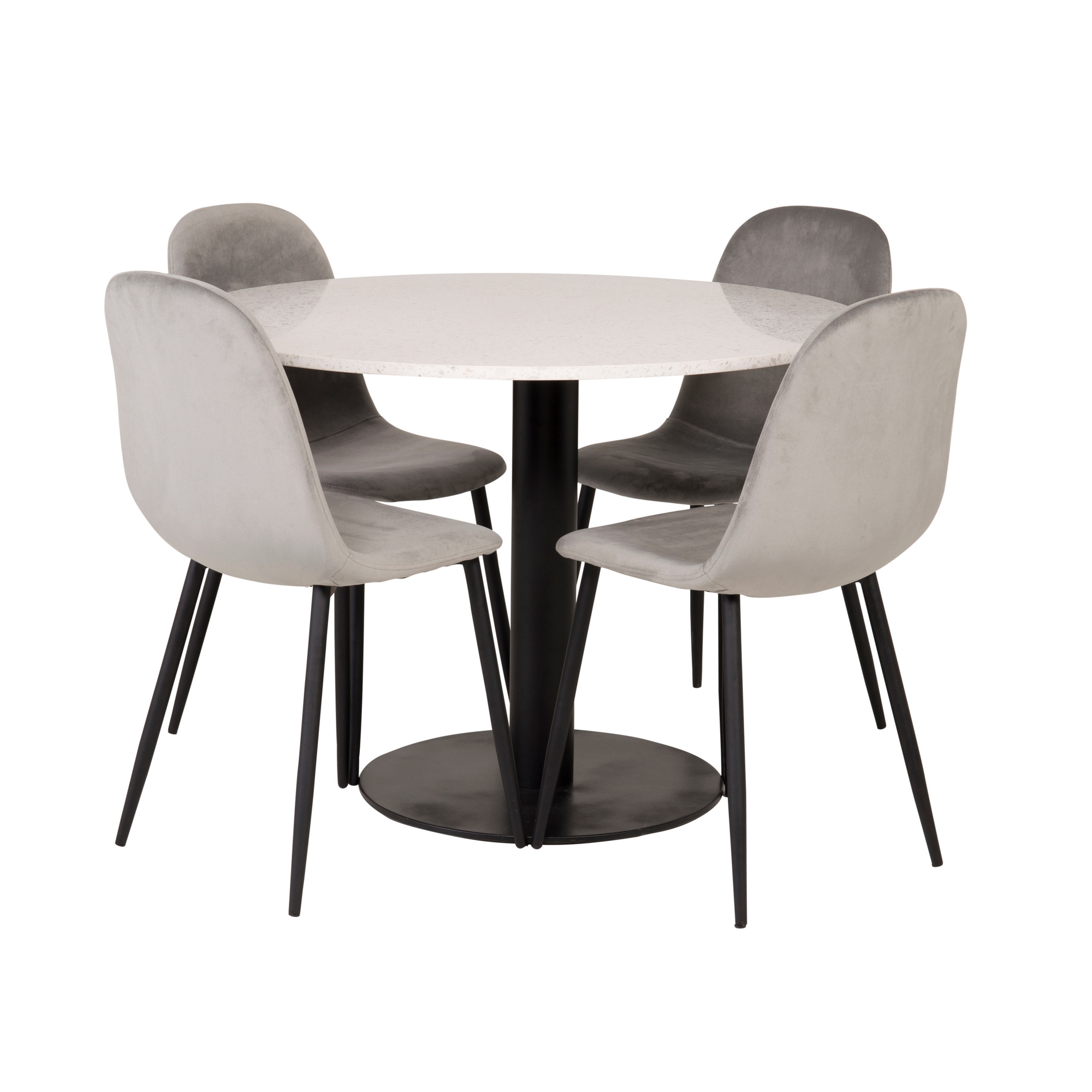 Matgrupp Roxanna Vit Bord med 4 Pobbie Stolar Sammet från Venture Home är en stilren matgrupp med ett runt matbord med en vit terazzo-bordsskiva och svart underrede i metall samt fyra Pobbie-matstolar i sammet.