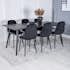 Matgrupp Venture Home Salt med 6 Phoi Stolar är en stilren matgrupp med ett rektangulärt matbord med en stomme och ben i svart pulverlackerad metall med en bordsskiva designad i två delar, i lättborstad svart ekfanér med en kärna av MDF. Bordet kan kompletteras med en iläggsskiva, ingår ej. Det medföljer sex matstolar i en helklädd design med ben i svart pulverlackerad metall. Stolarna har en lätt rundad rygg och sits i stoppat sammetstyg med dekorsömmar på insidan av rygg och sits som bildar ett rutmönster. Lättare montering krävs.