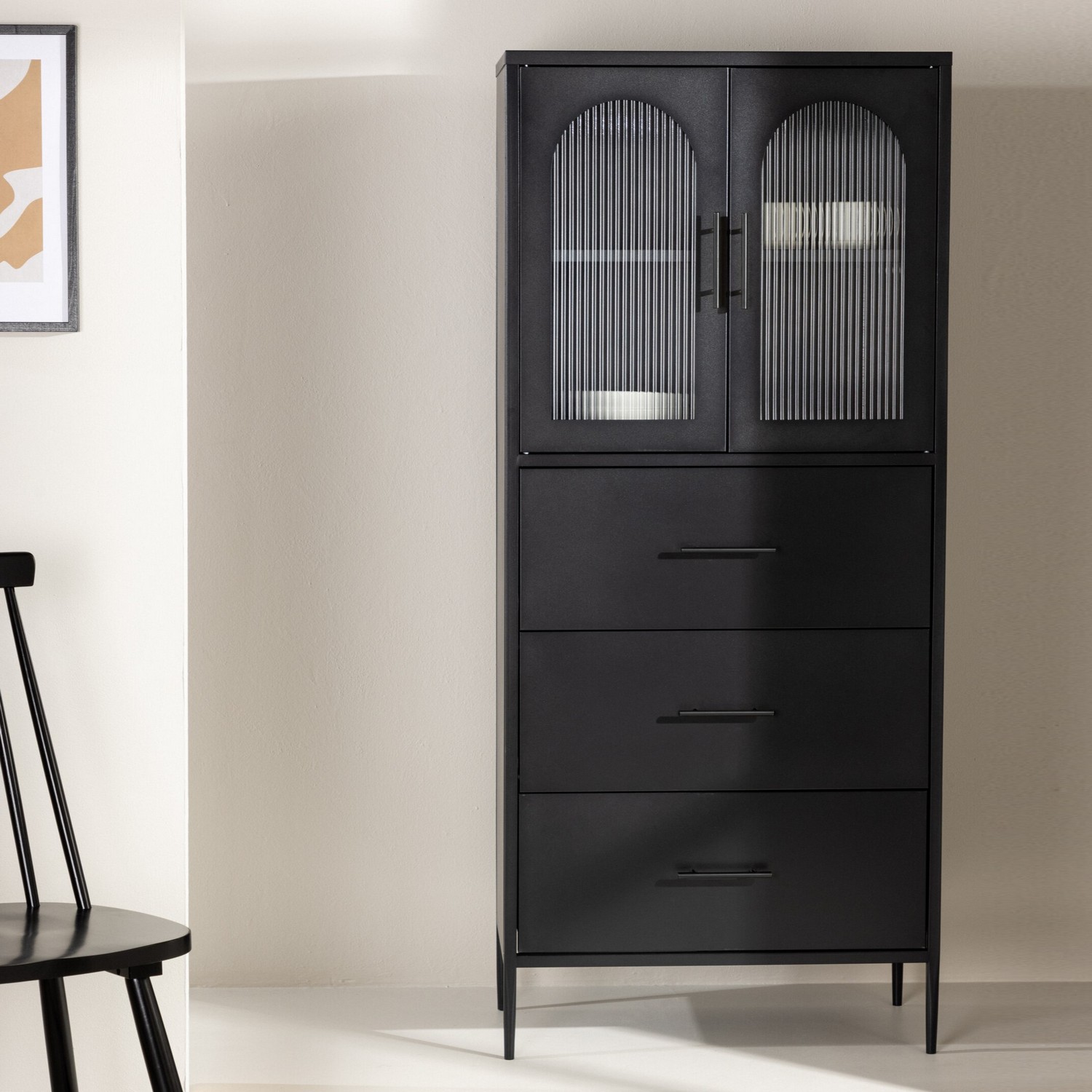 Med sina fyra smala ben skapar skåpet en känsla av lätthet och ger även din dammsugare enkelt utrymme. Tre generösa lådor längst ned erbjuder dold förvaring och bidrar till att hålla ditt utrymme organiserat och prydligt. Det översta skåpet har två vackert veckade glasdörrar, som ger en liten glimt av dess innehåll. Dess valv-formade design tillför en touch av elegans och skapar en pampig känsla i ditt hem.