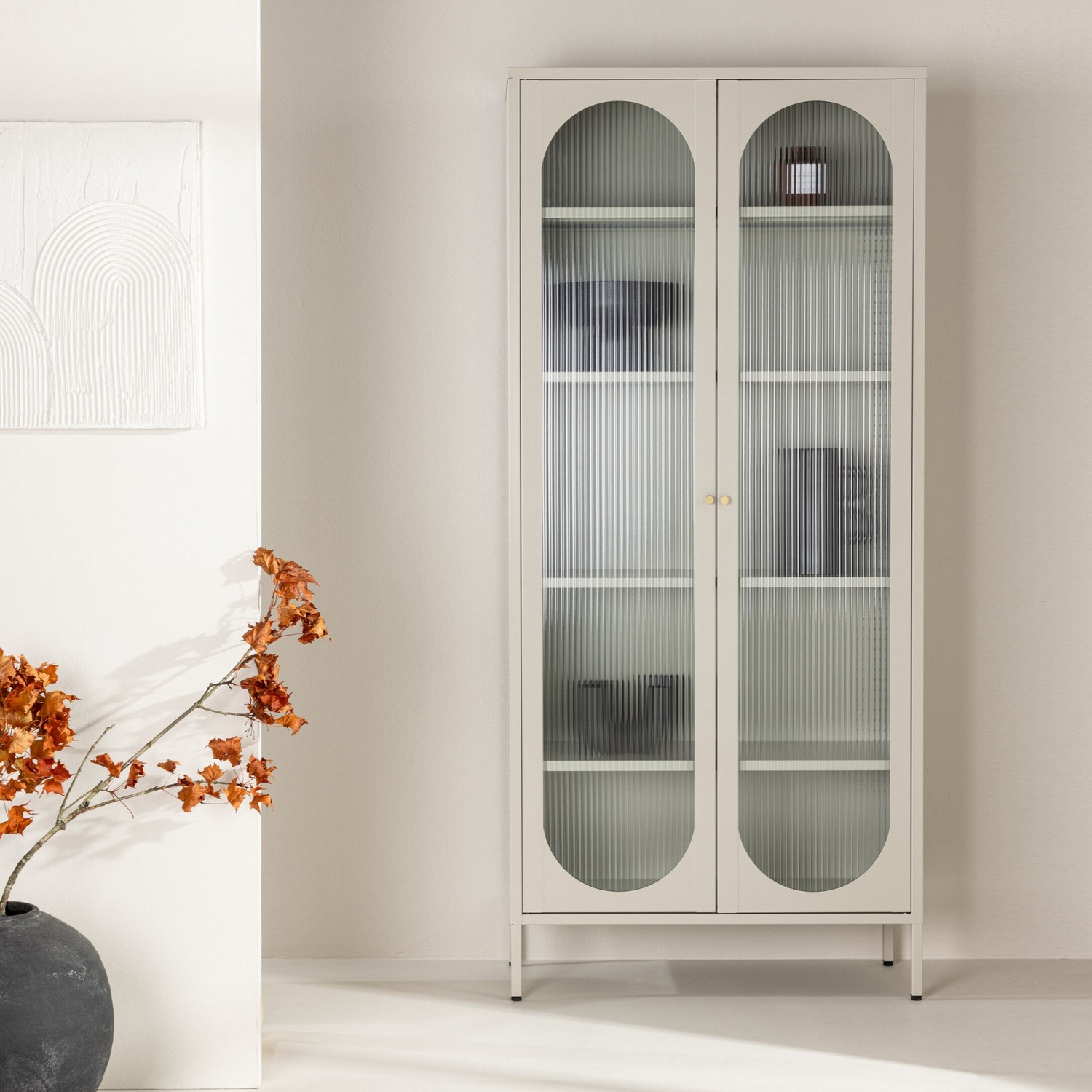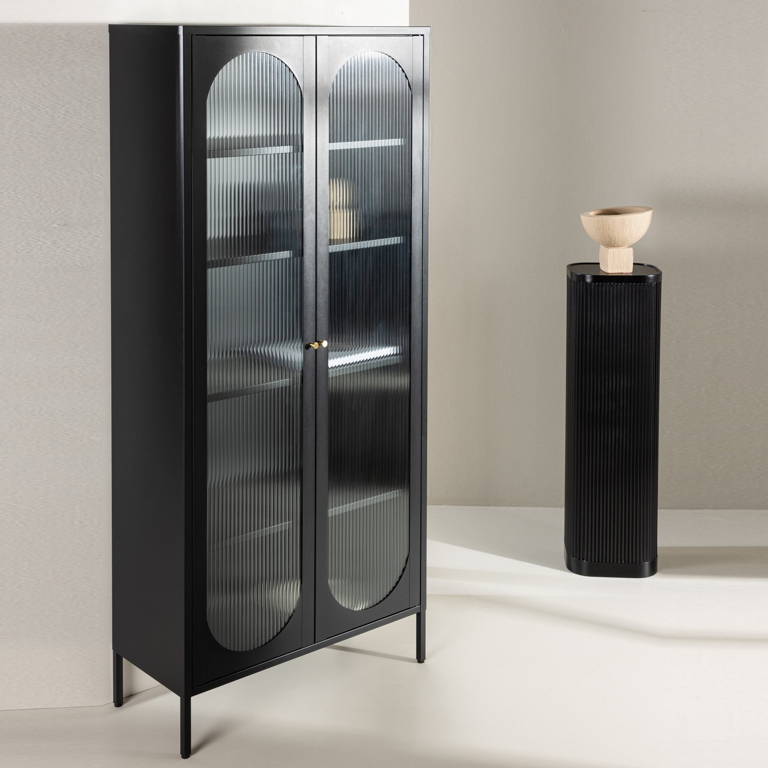 Lima är ett elegant svart skåp tillverkat i stål, vilket ger det en stabil och hållbar konstruktion. Dess moderna och minimalistiska design kommer att vara ett smakfullt tillskott till ditt hem. Skåpet har fyra generösa hyllplan som ger gott om plats för att organisera. De två dörrarna är tillverkade av vågigt glas, vilket ger en intressant visuell dimension och en touch av textur till möbeln.