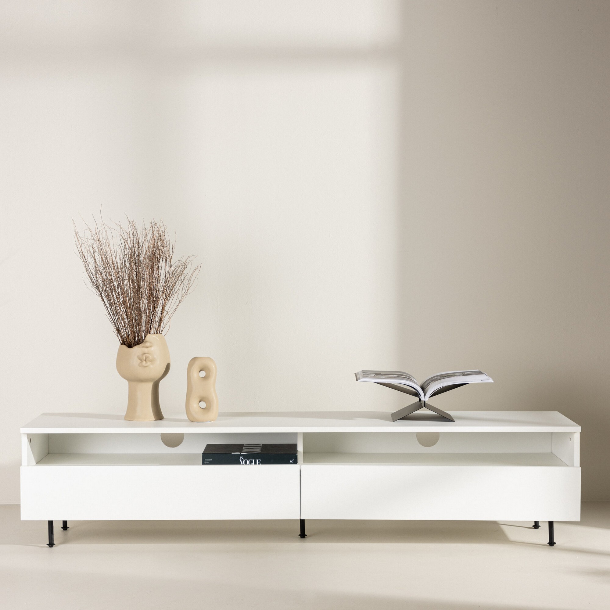 Den här Tv-bänken lutar mot fyra smala ben som lyfter upp den till en stilren nivå. Men tv-bänkens höjd ger inte bara ett lyft till din inredning utan underlättar också din städrutin – här kommer dammsugaren smidigt under och håller rent i ditt hem.