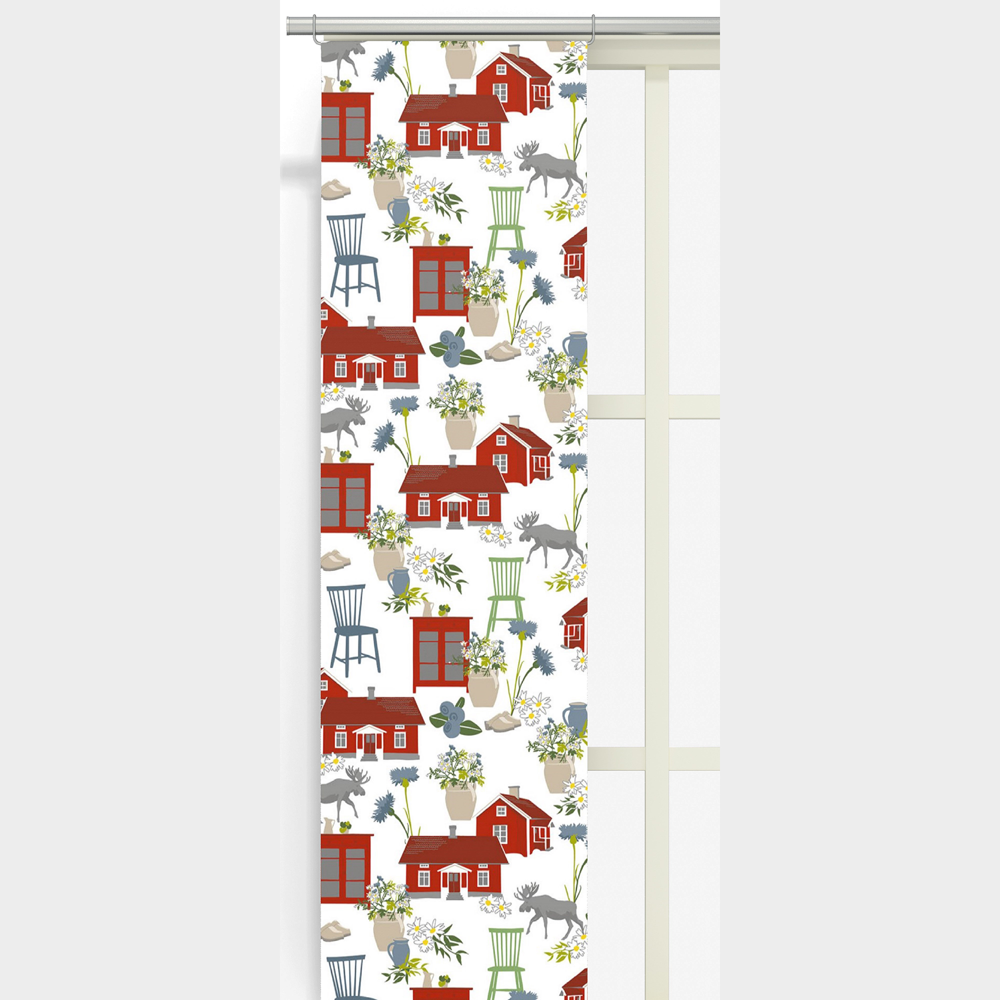 Panellängd från Arvidssons Textil. Svenskdesignat mönster med röda stugor, älgar och blommor. Tillverkad i bomull.