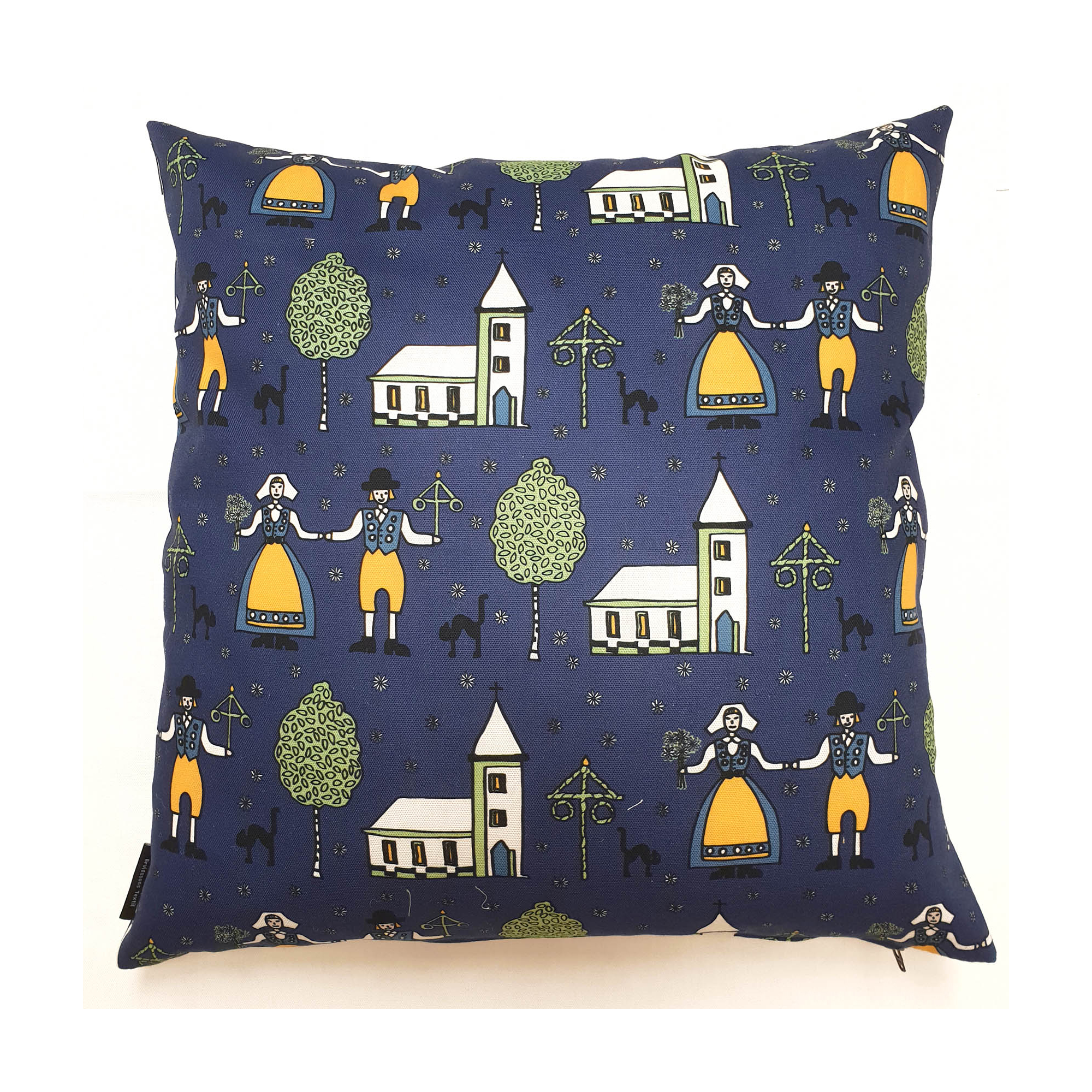 Kuddfodral från Arvidssons Textil. Svenskdesignat mönster med människor i folkdräkt, midsommarstång & kyrkor. Tillverkad i bomull.