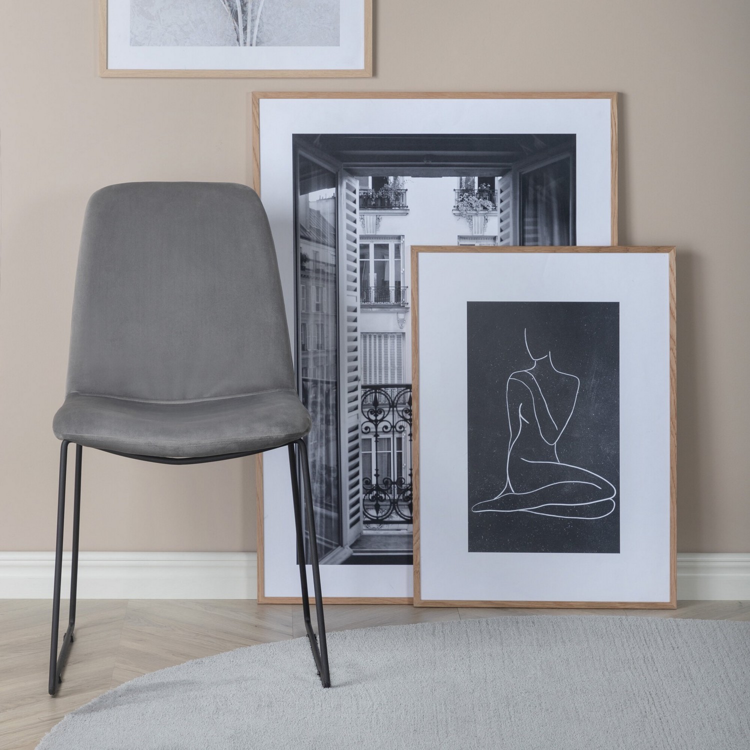 Muce från Venture Home är en matstol i helklädd design med benställning i svart pulverlackerad metall. Rygg och sits är av sammetstyg med mjuk stoppning.