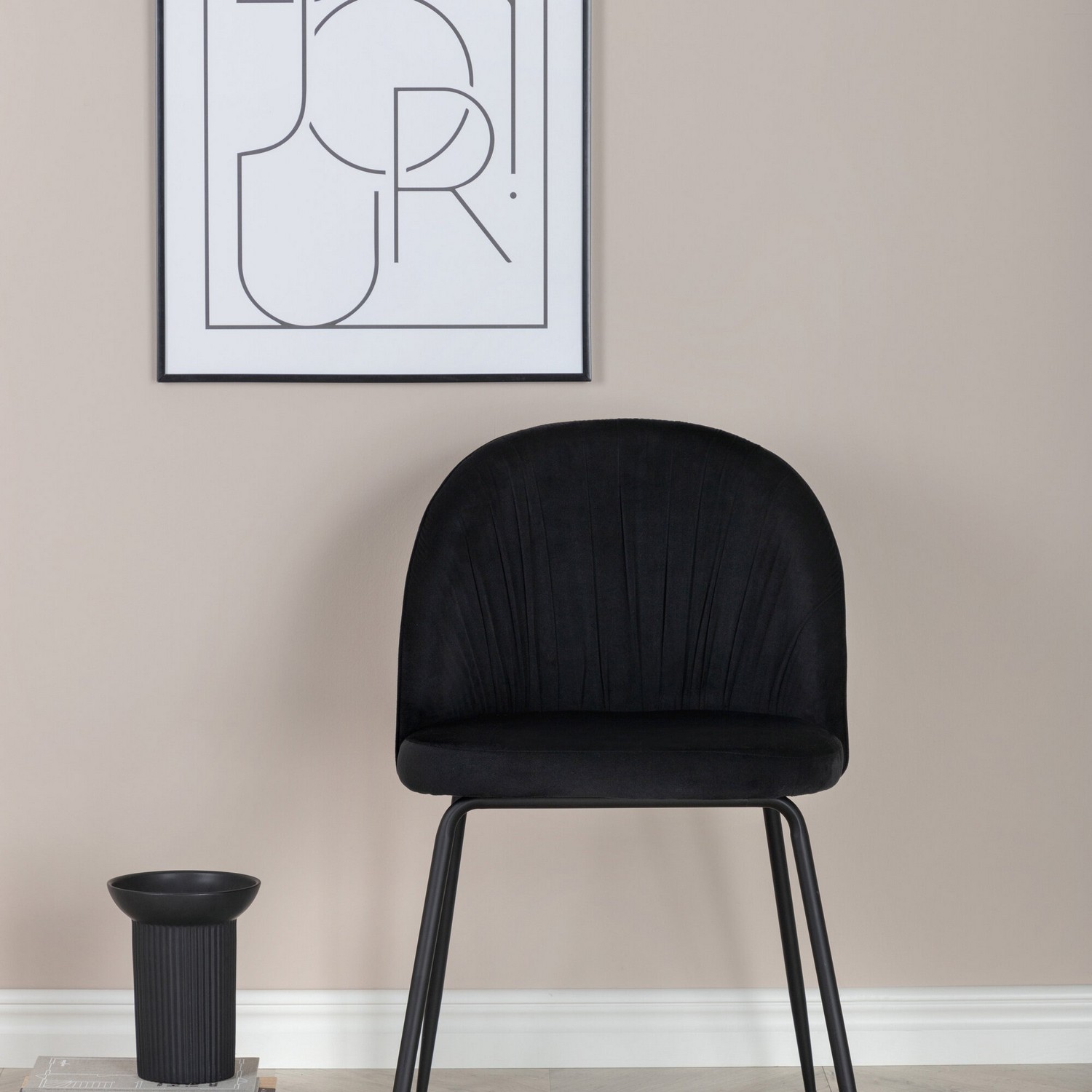 Wrinkles är en matstol i exklusiv helklädd design med ben i svart, pulverlackerad metall. Stolen har rundad rygg och sits med rynkat sammetstyg och dekorsöm. Ryggen och sitsen har mjuk stoppning.