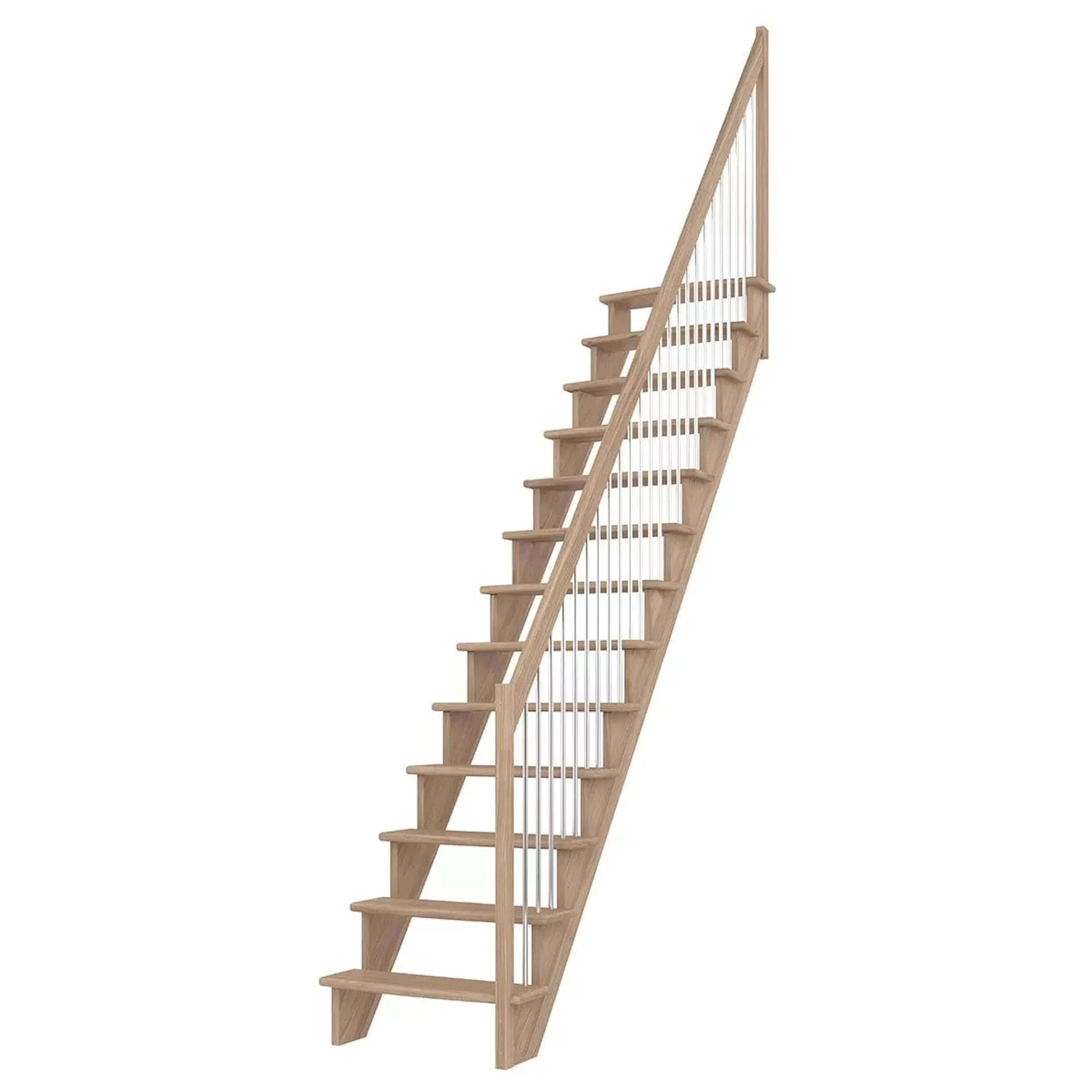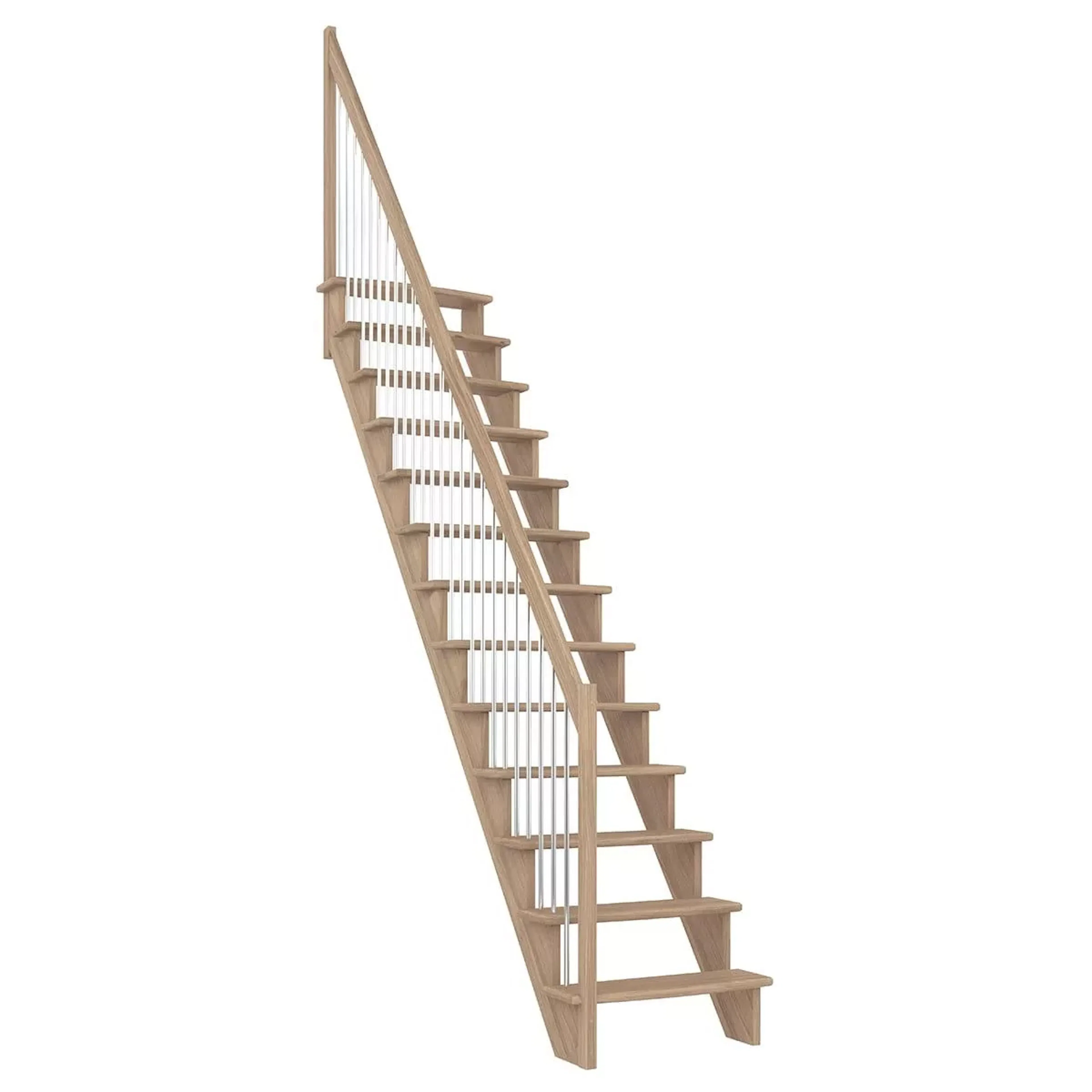Lyon är en platsbesparande trappa från Dolle med vertikalt metallräcke. Trappan finns i rakt och 1/4 svängt utförande med val av sida för räcket. Trappan är tillverkad i massiv ek med 21 cm djupa och lätt rundade steg som ger en bekväm yta att gå på.