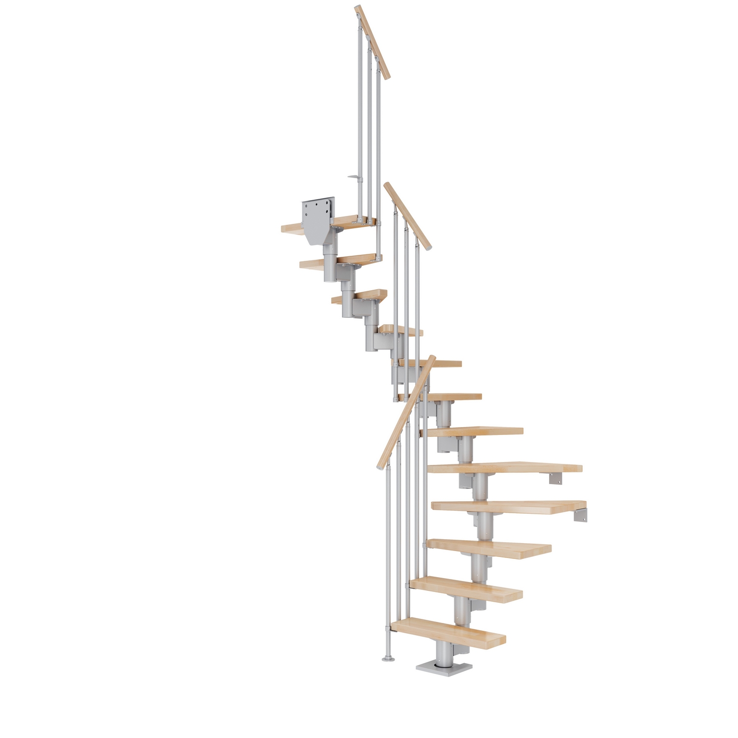 11-15 massiva trästeg ingår som ger en maximal golv-till-golvhöjd på 360 cm. Vid 13-15 steg är det nödvändigt att installera stödstolparna som ingår i paketet. Om golv-till-golvhöjden inte är nödvändig avlägsnas steg helt enkelt tills önskad höjd nås. Trappans ytor är otroligt slitstarka, tål repor och är lätta att underhålla tack vare den halvblanka ytan. Höjden på varje steg kan justeras mellan 18,5 och 22,5 cm.