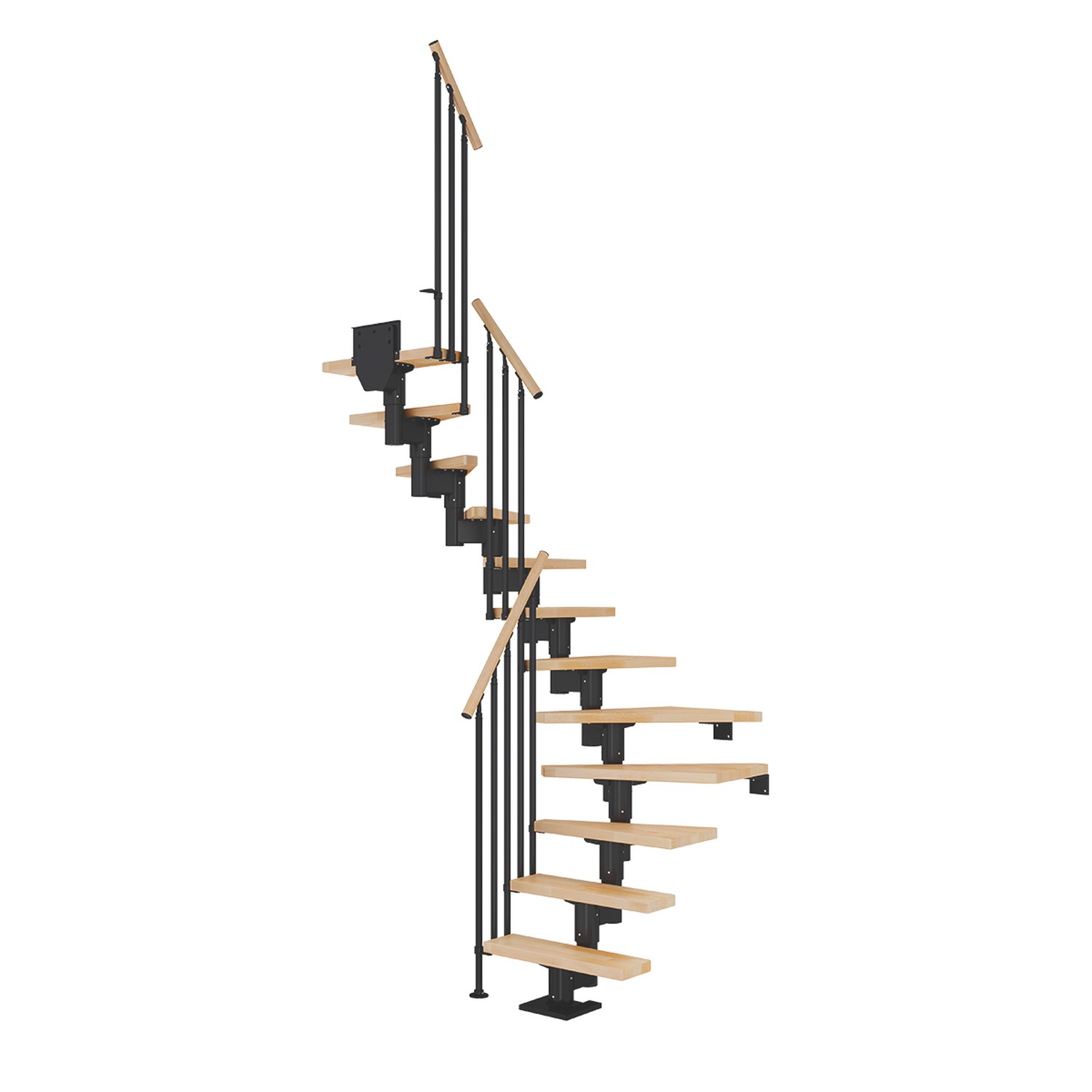 Halvsvängningen kan placeras var som helst på trappan i linje med dina behov. Fyra väggfästen ingår i förpackningen. Alla fyra behövs om du installerar den med halvsvängd form.