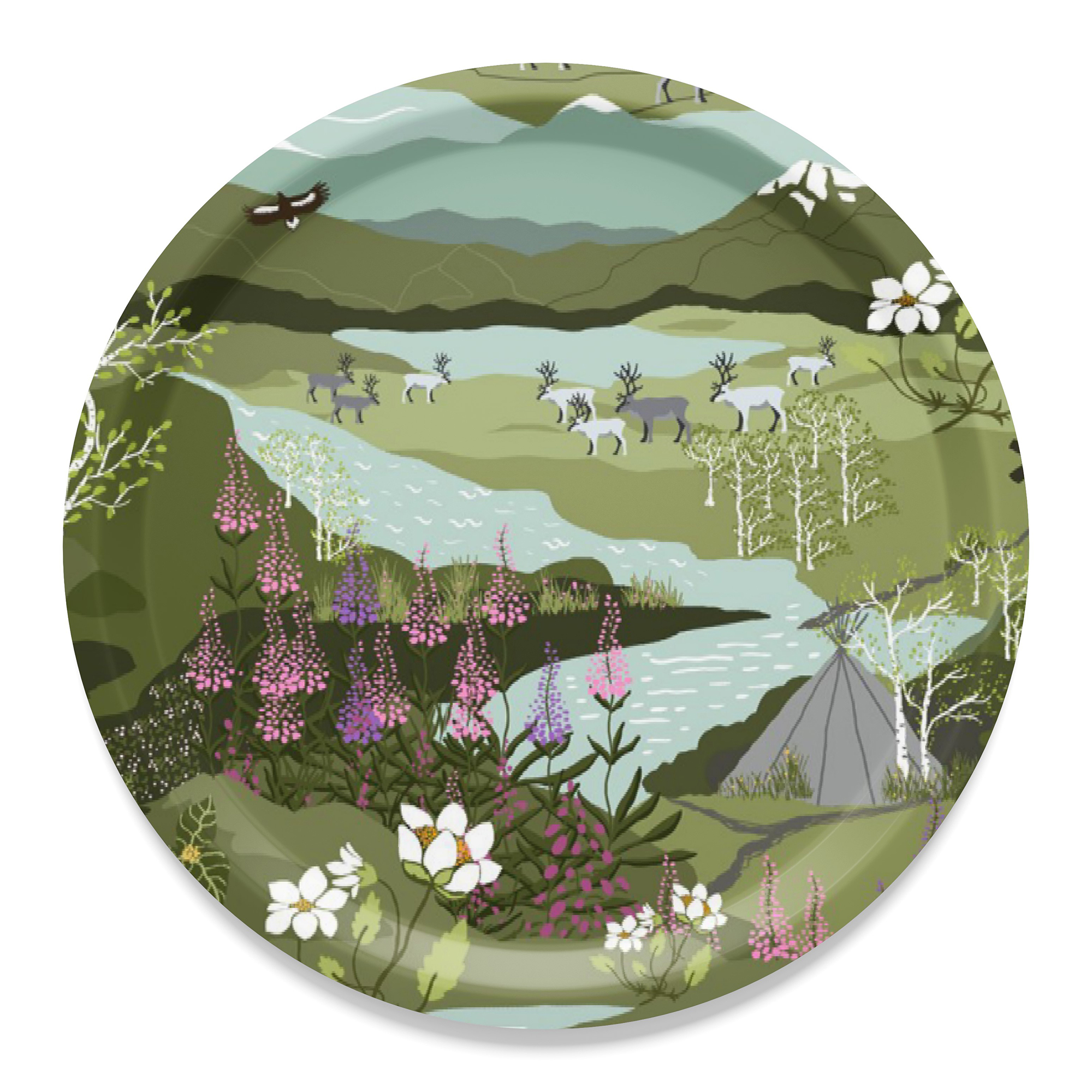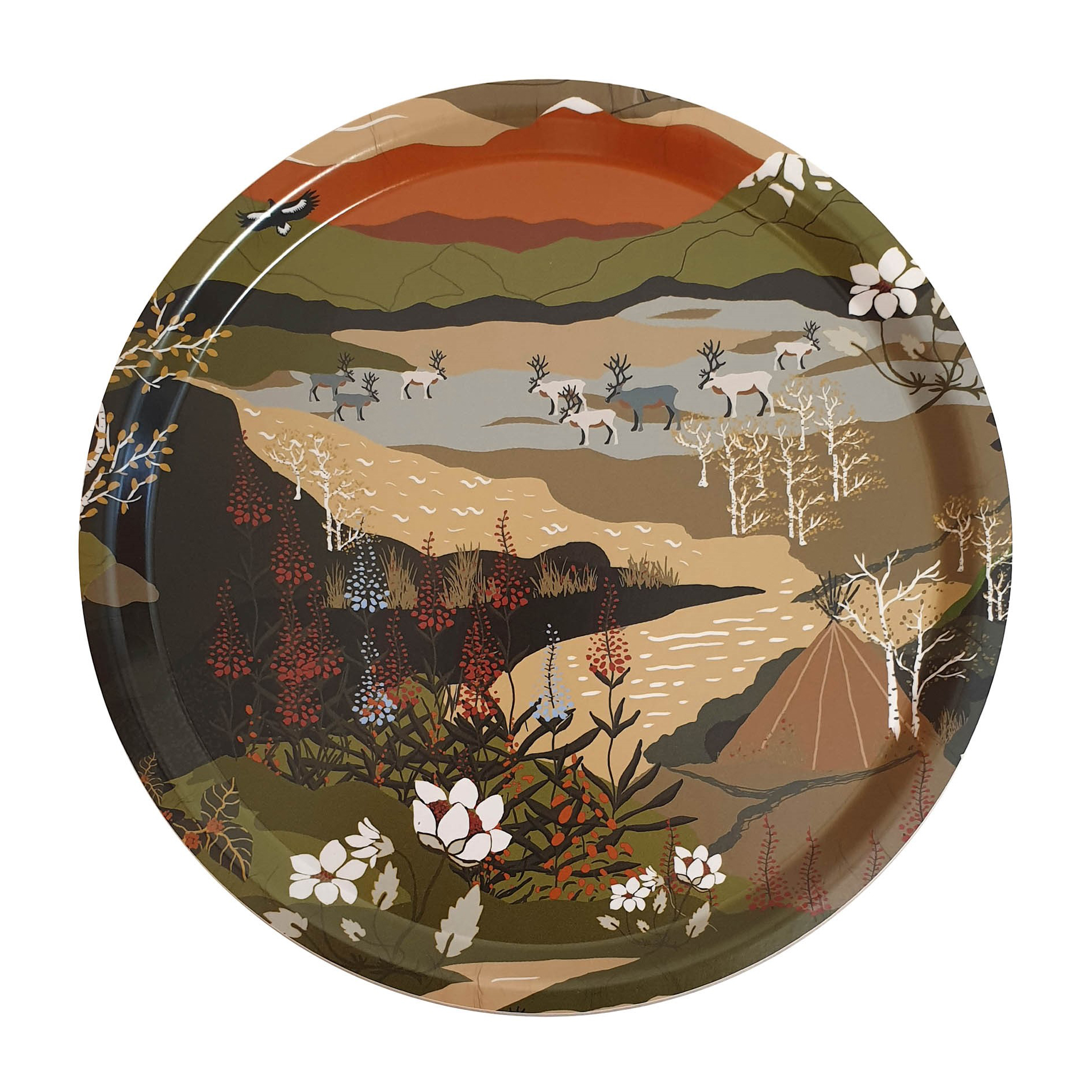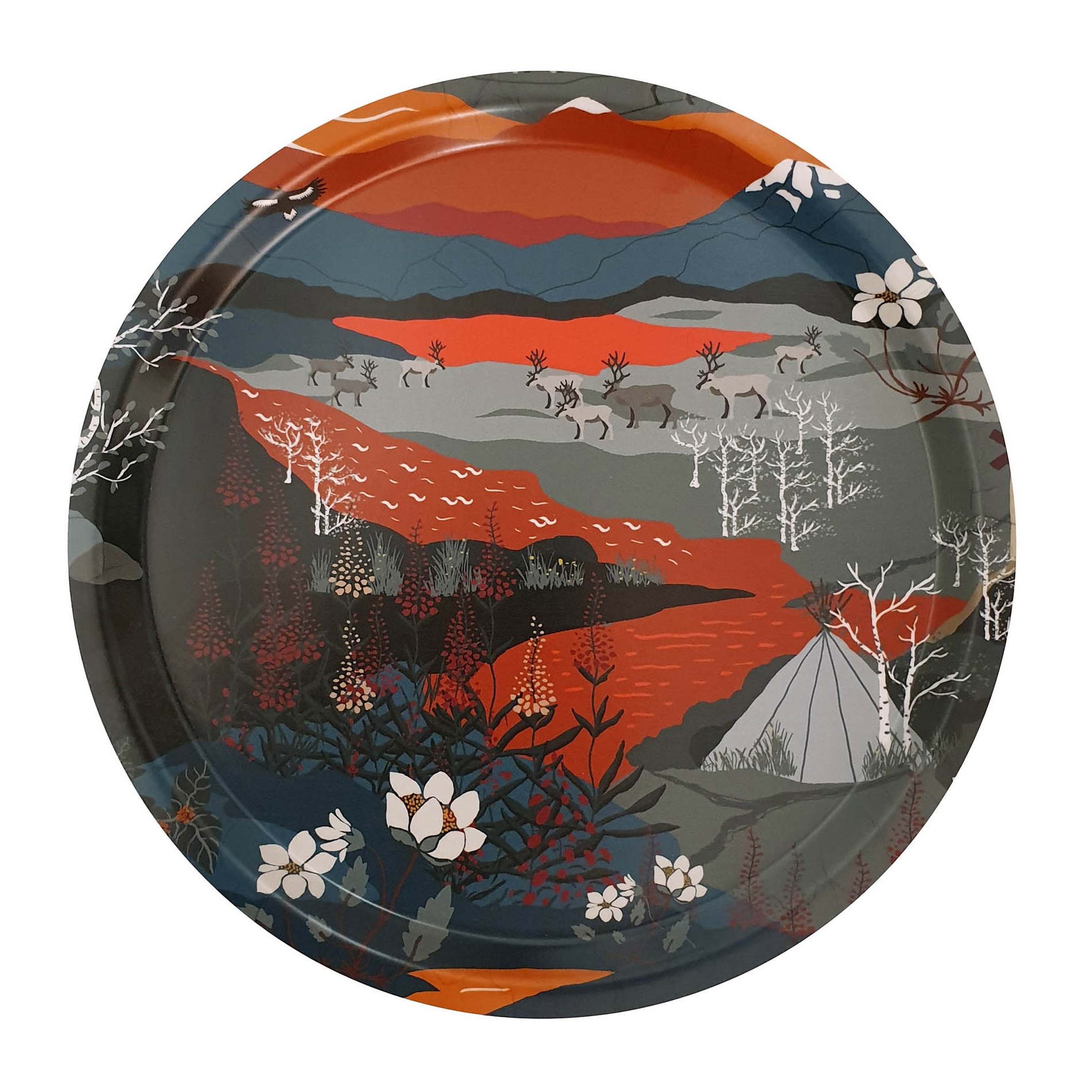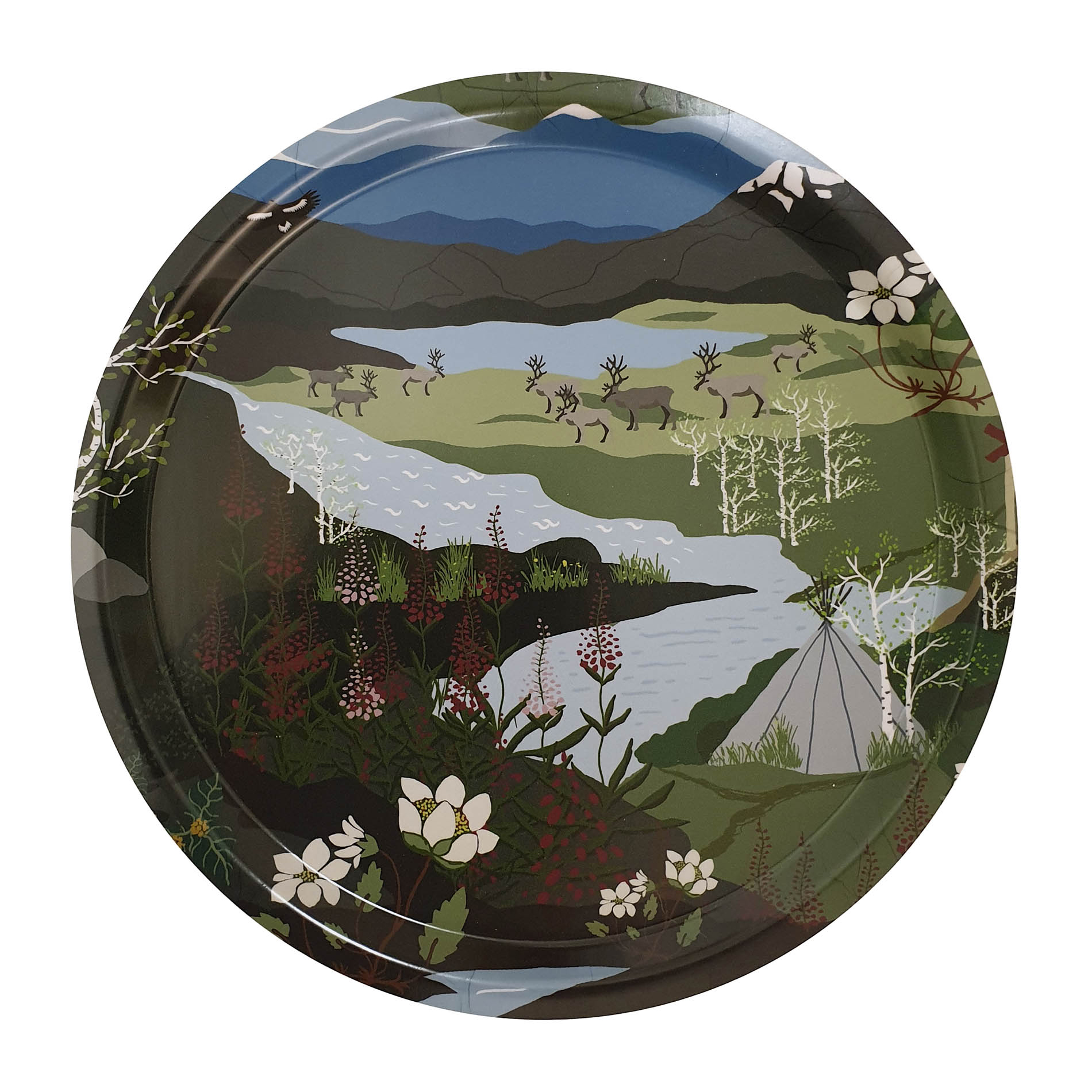 Rund bricka från Arvidssons Textil. Svenskdesignat mönster med motiv av härliga fjällandskap med renar och solnedgången. Tillverkad i Sverige. Design av Louise Videlyck.