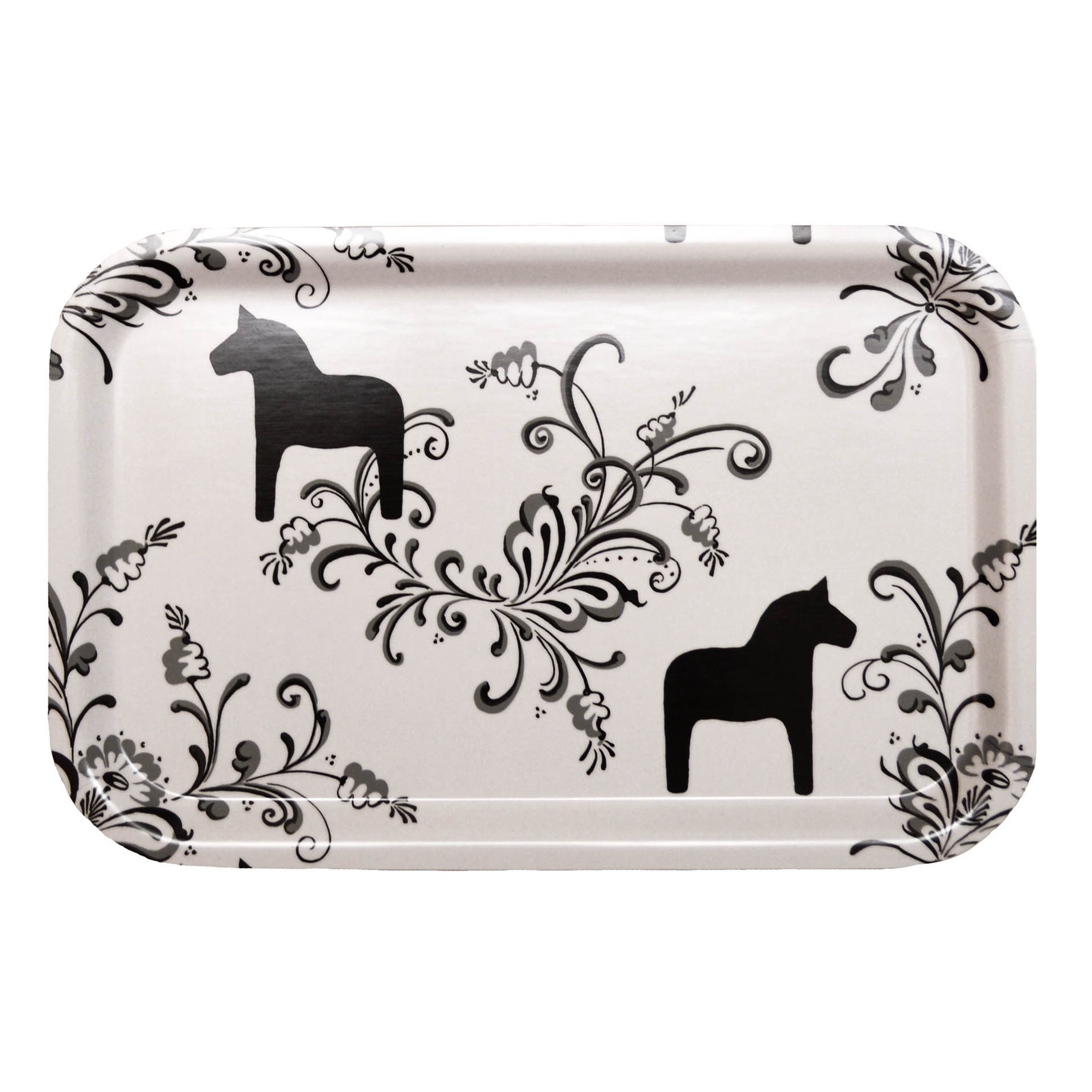 Bricka från Arvidssons Textil. Svenskdesignat mönster med dalahästar och kurbitsmotiv. Tillverkad i Sverige.