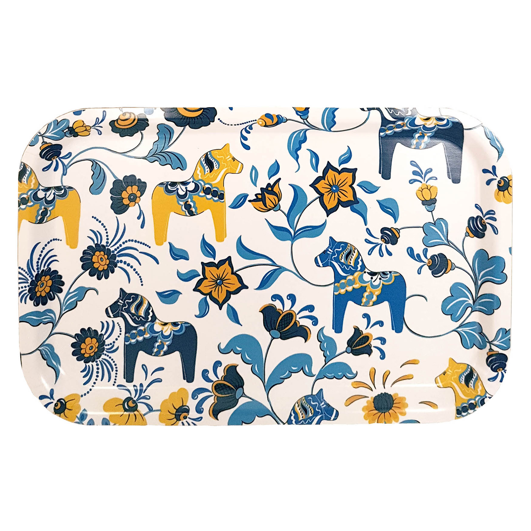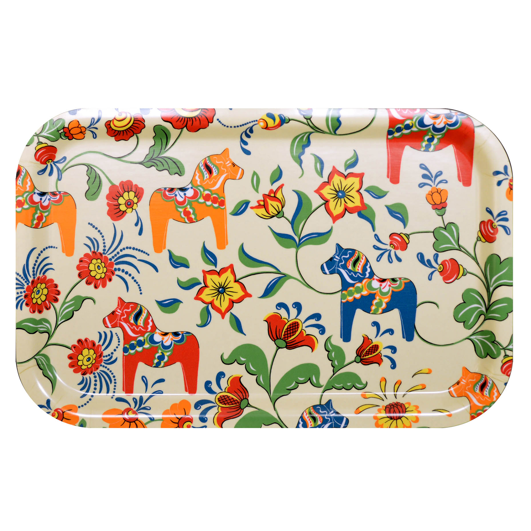 Bricka Leksand från Arvidssons Textil. Svenskdesignat mönster av Carola Bengtsson-Malmström. Med dalahästar och kurbitsmotiv i glada färger. Tillverkad i Sverige.