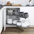 Det smarta hörnskåpsutdraget Le Mans II från Kesseböhmer kombinerar elegant design och funktionalitet. Med 85° öppningsvinkel optimeras lagringsytan i skåpet.