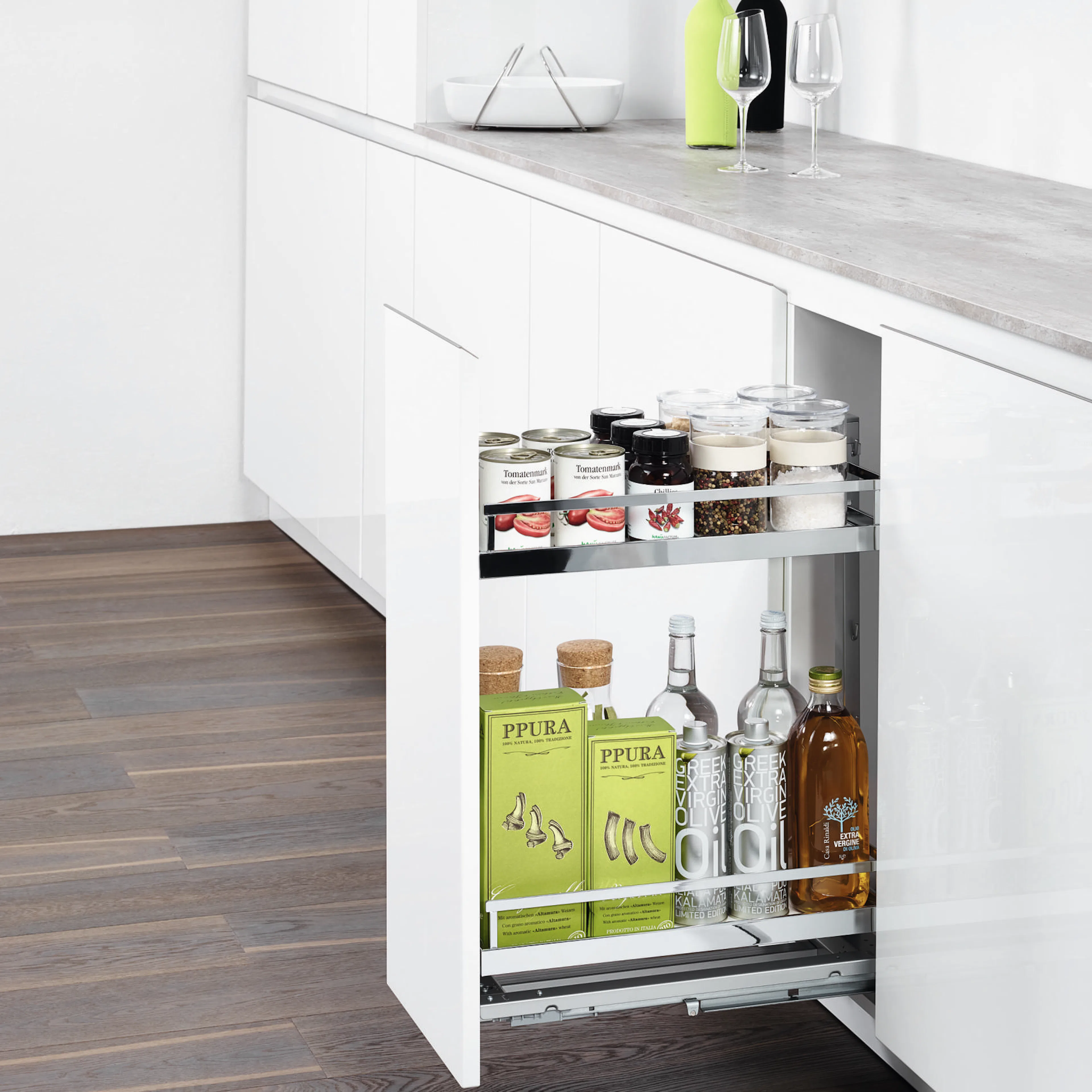 Dispensa Junior maximerar lagringskapacitet och organisationsmöjligheter i köket. Innehållet är tillgängligt från båda sidor vilket gör det lätt att komma åt det du förvarar i skåpet. Dispensa Junior levereras komplett med monteringsset för bottenmontering och 2 hyllplan.