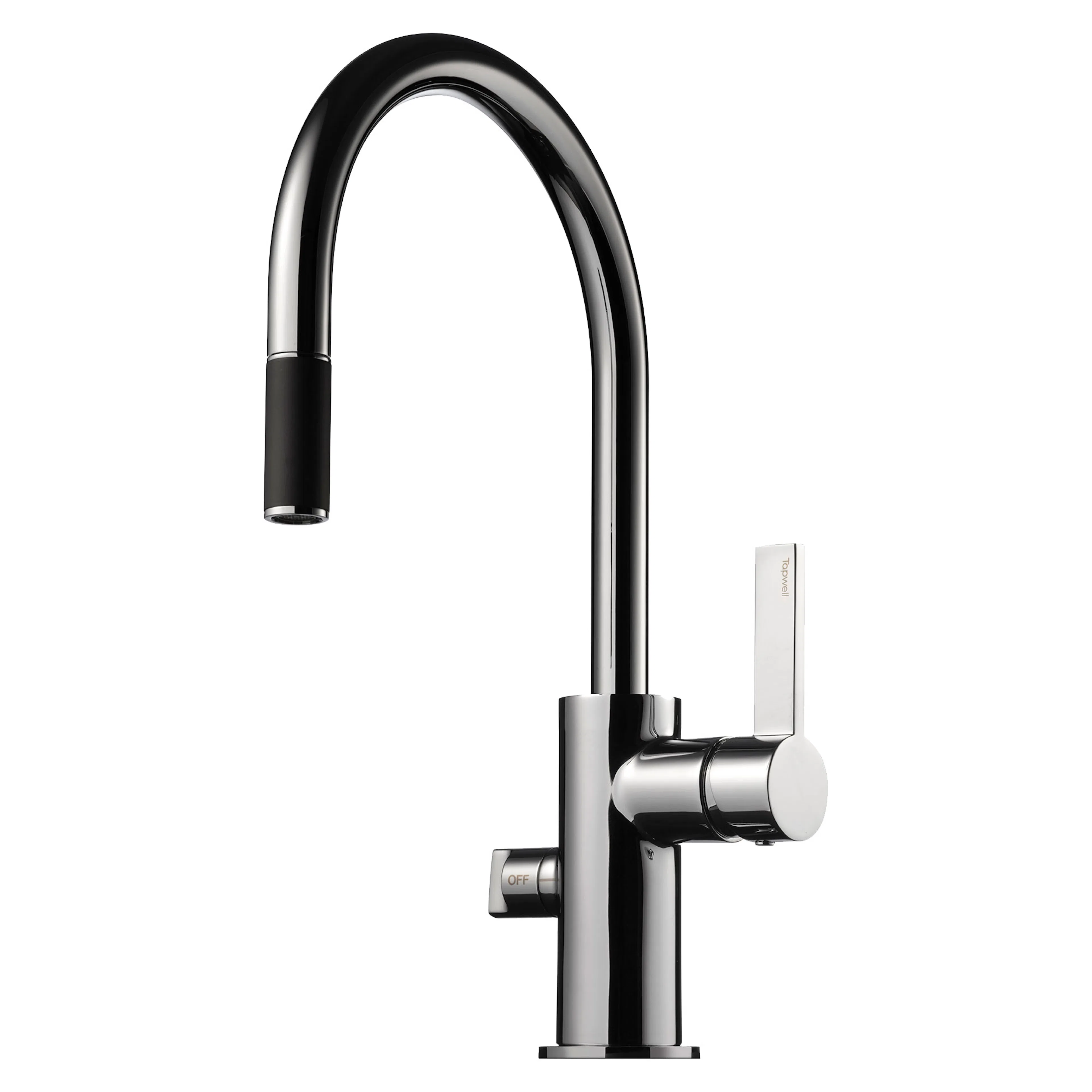 Köksblandare Tapwell ARM385 med svängbar pip, diskmaskinsavstängning och utdragbart munstycke. Pipens svängradie går att begränsa till mellan 60 och 270 grader med 15 graders intervaller. OBS - håltagning Ø40 mm.