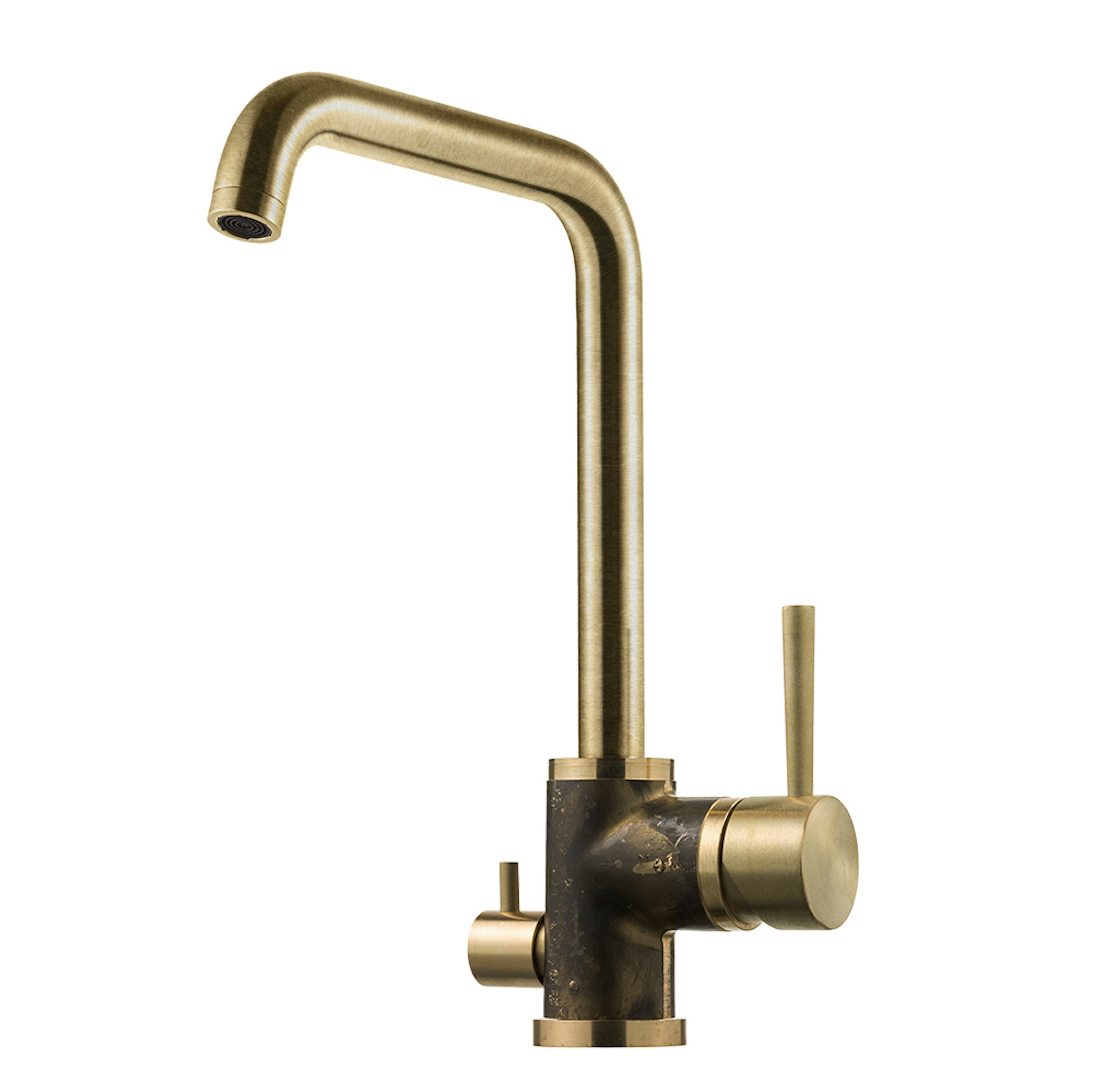 OBS! Mässing- och kopparytor är handpolerade på fabriken. Eftersom Tapwell endast använder en naturlig metall, bildar ytan patina över tiden vilket kan ge en mörk och robust ton (se exempel på bild ovan). Detta ser ut som en form av mörka fläckar där fukt har hittats. Detta är en naturlig reaktion när metallen kommer i kontakt med syre och vatten. Eftersom alla Tapwellblandare testas med vattentryck före leverans från deras fabrik kan kondens finnas kvar i kartongen, vilket kan göra patineringsprocessen kan börja även innan produkten är på plats. På mässing är det möjligt att återställa den ursprungliga glansytan, genom att polera med mässingsputs.